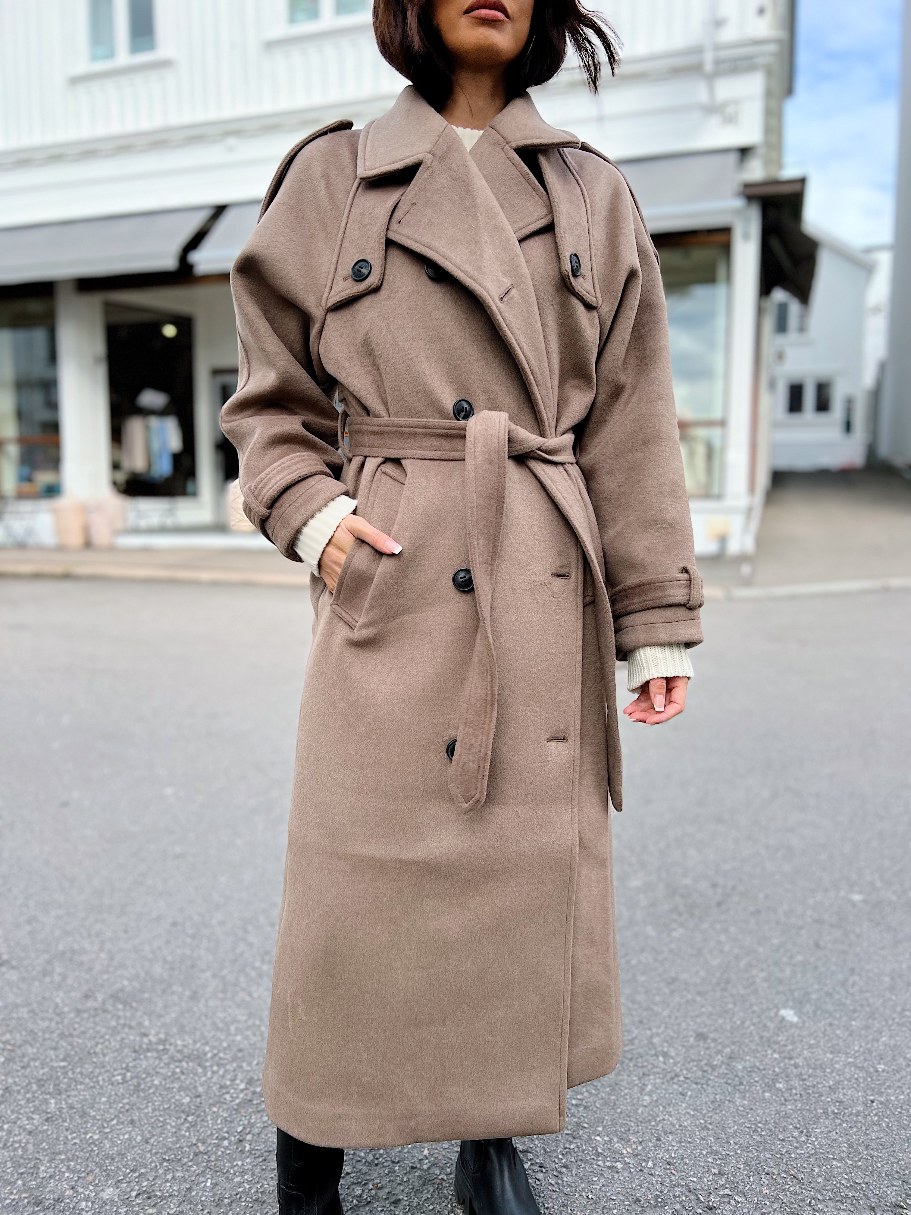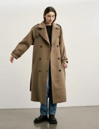 «Bea wool coat» fra Meotine er en dobbeltspent kåpe kuttet av svart ullblanding med tynt fôr. Den er formet til en overdimensjonert silhuett med jakkekrage, skulder- og mansjettdetaljer, stormklaff bak og to skjulte frontlommer og høye splitter bak. Bruk den med eller uten det valgfrie beltet for å omfavne en oversize-look eller fremheve midjen.