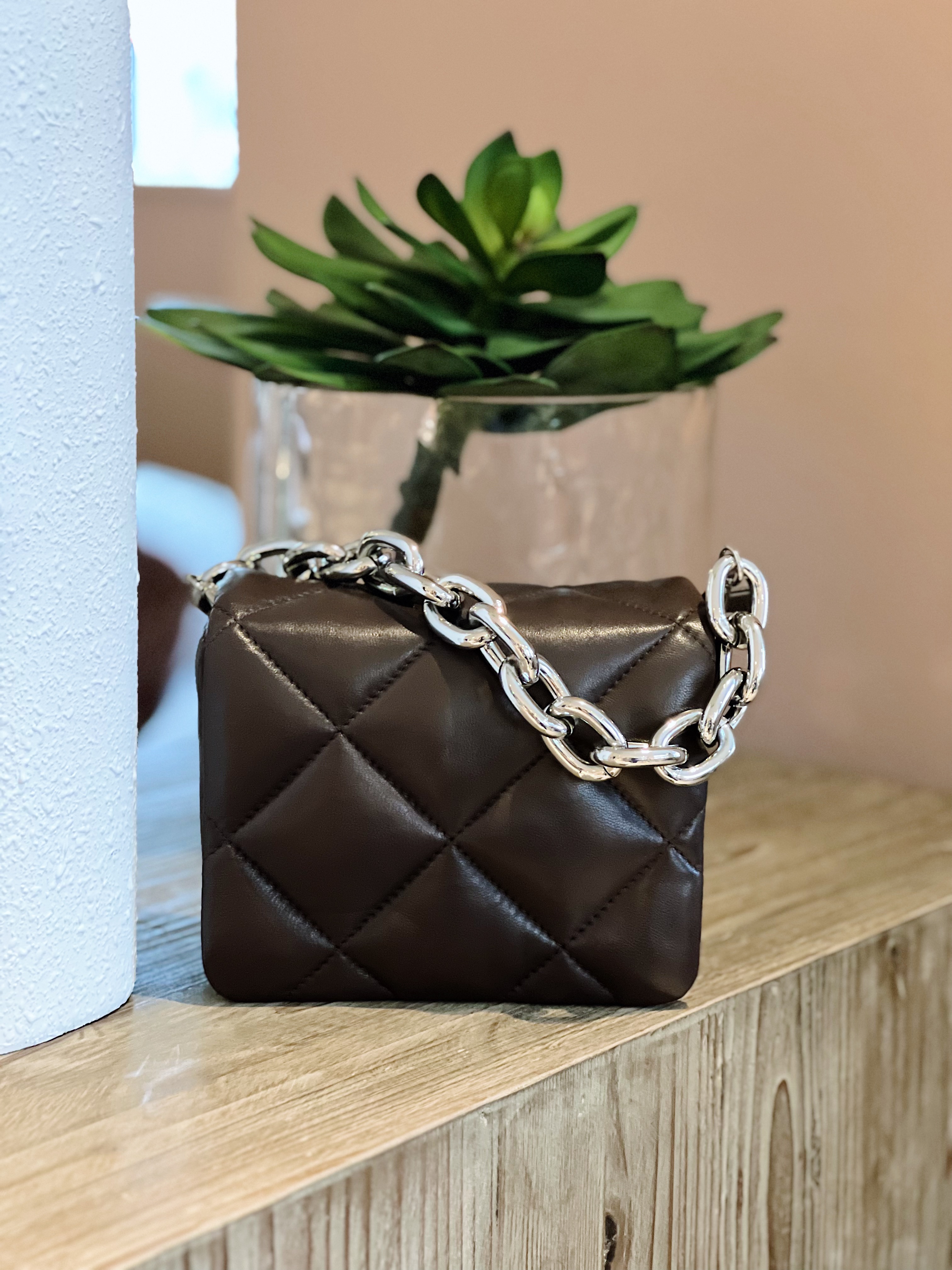 «Hestia bag» fra Stand Studio er en rålekker skinnveske. Avtakbar lang skulderstropp, Chunky kjedehåndtak, Innvendig skinnlomme, Magnetisk knappelukking