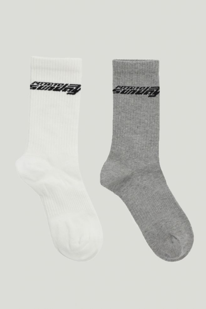 «Knit logo socks 2 pack» fra Rotate. Knit Logo Socks er laget av en blanding av økologisk bomull og resirkulert polyamid og har en brodert ROTATE Sunday-logo på toppen av de ribbestrikkede, elastiske faldene.