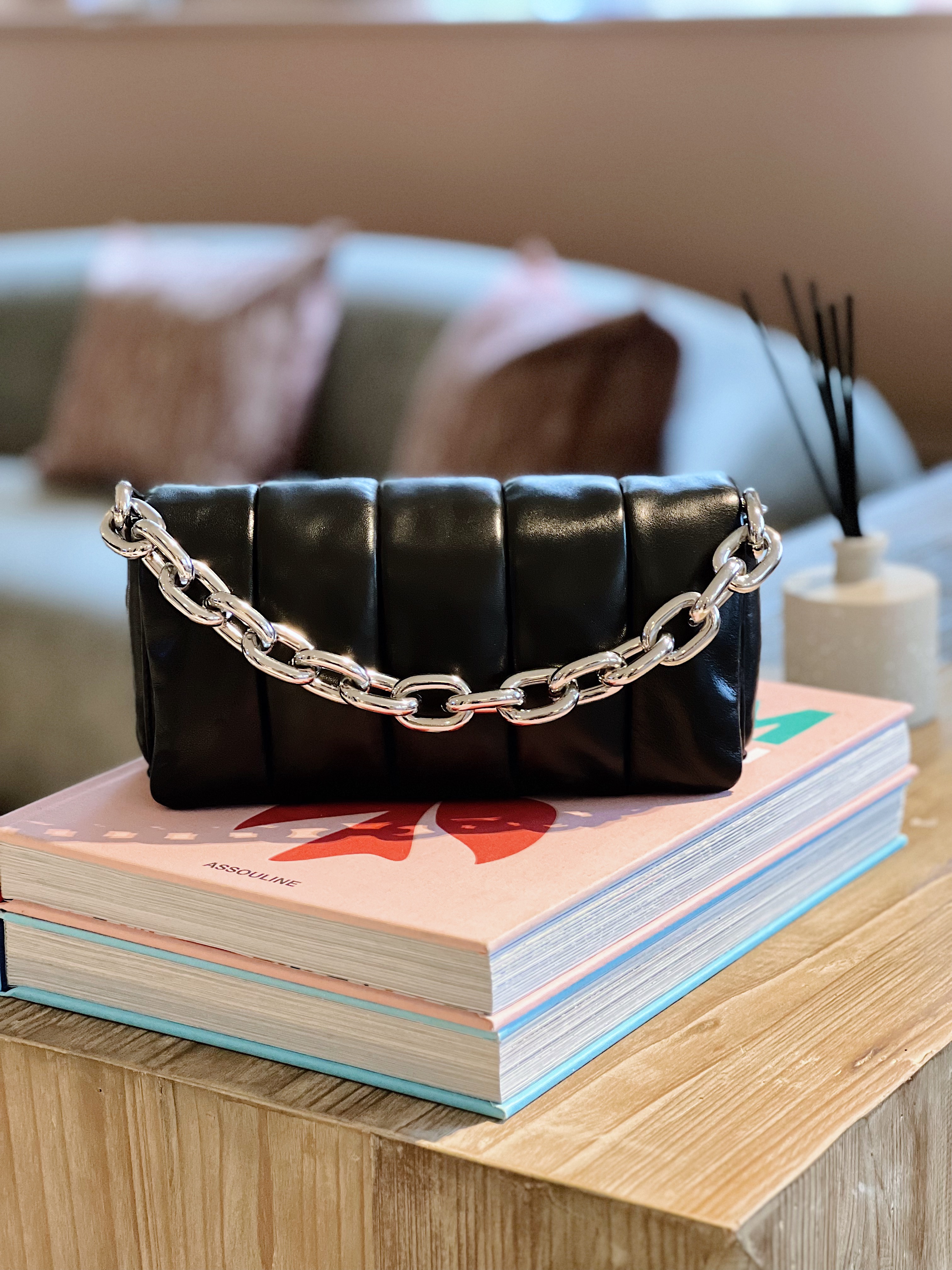 «Hera Panel Bag» fra Stand Studio er en rålekker skinnveske. Avtakbar lang skulderstropp, Chunky kjedehåndtak, Innvendig skinnlomme, Magnetisk knappelukking