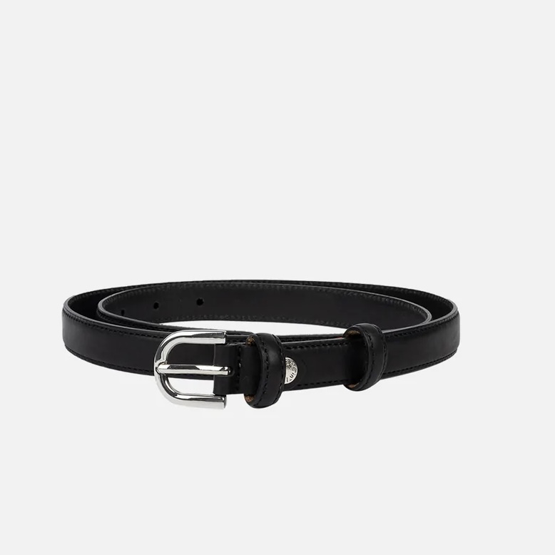 «Ebba» fra Re: Designed by Dixie. Slankt og enkelt skinnbelte med en skinnende sølvfarget spenne og belteløkker i skinn. Et tidløst og stilig valg for et elegant utseende.