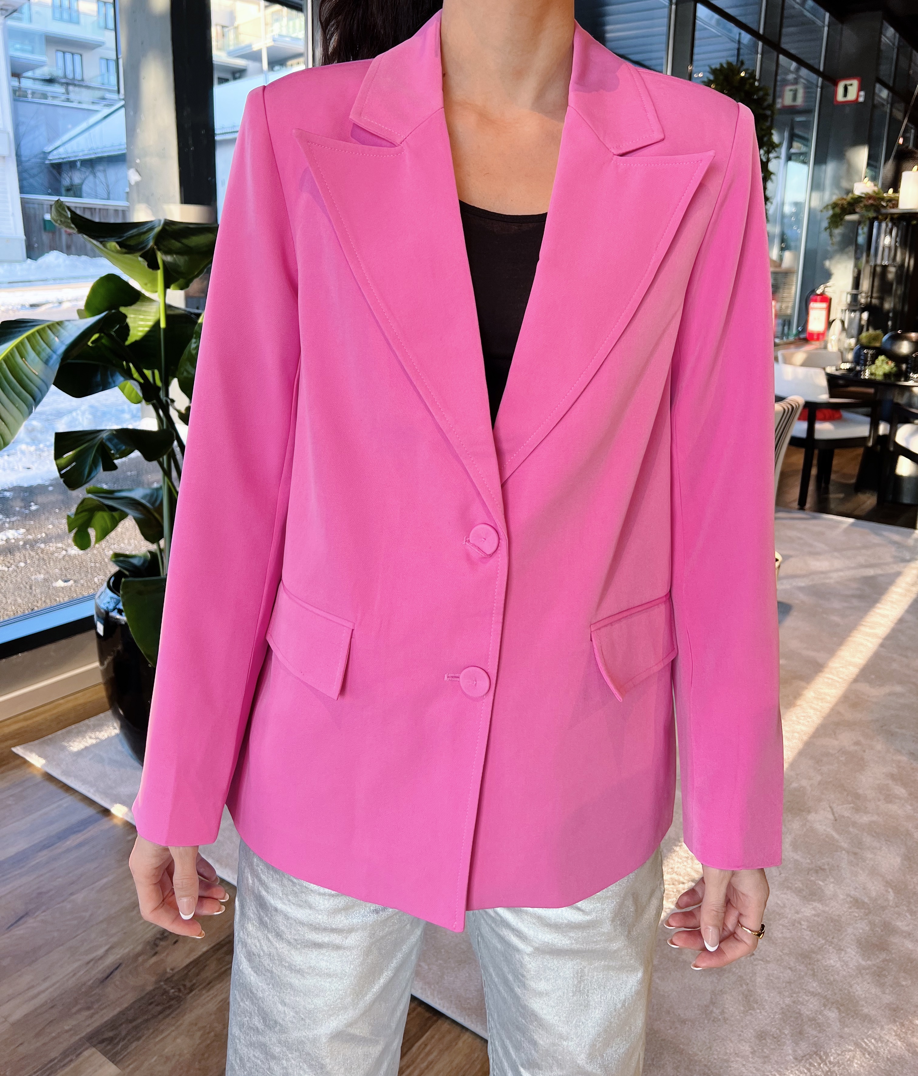 «Aza blazer» fra Yas. Stilig oversized blazer i en nydelig rosafarge. Blazeren har knepping i front med rosa knapper og lommer med klaff.