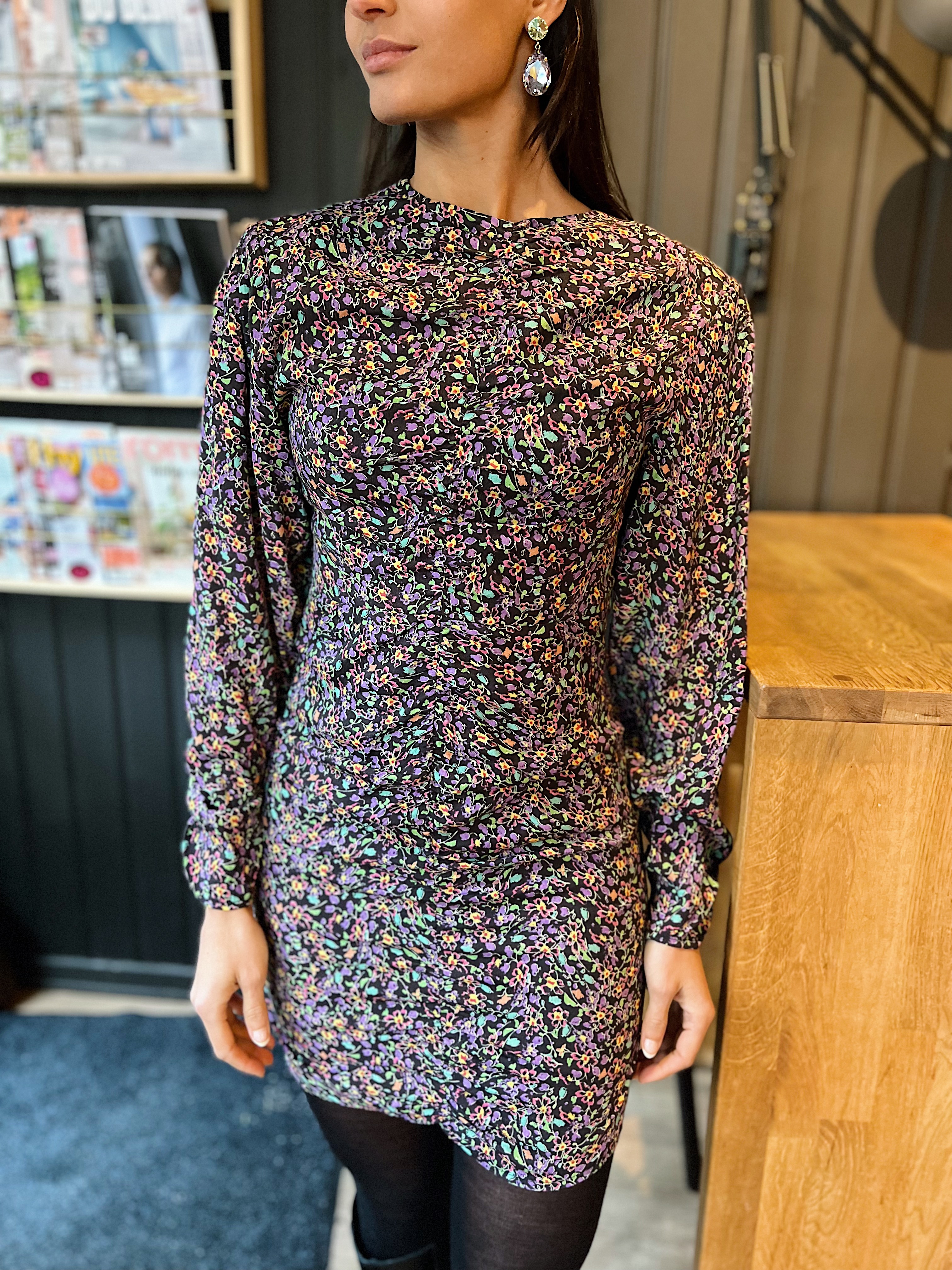 «Pose dress PO» fra det norske merke Iben. Nydelig minikjole med lekkert mønster. Kjolen har rund hals og lang erm. Kjolen har rynkedetalj forand.