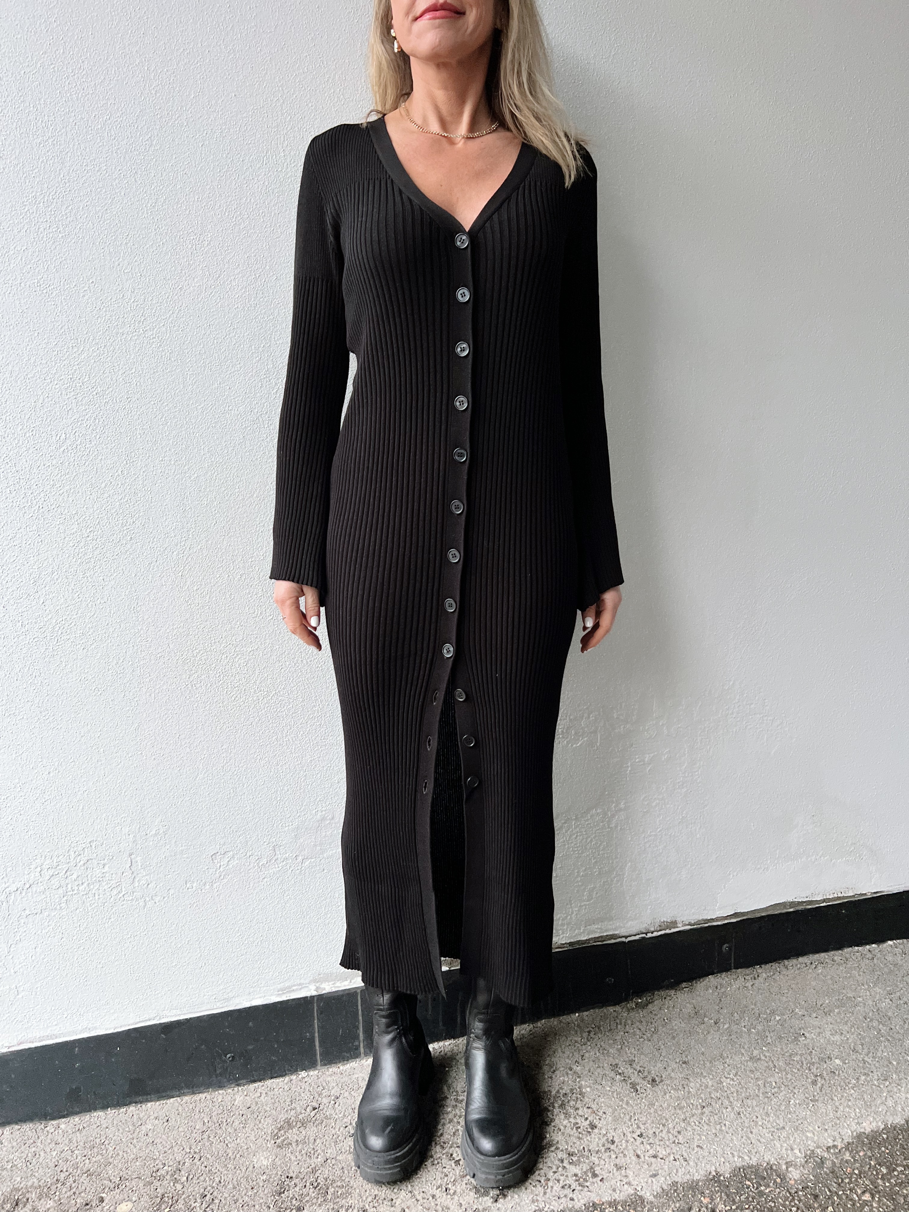 «Adalea dress» fra Gestuz. En elegant cardigan-inspirert midi-lengde kjole. Med et flatterende, figursydd snitt, knapper foran og knappedekor i halsen. Utskåret fra en ansvarlig blanding inkludert Naia-acetat. Bruk den alene eller hold bare de øverste knappene lukket og sammen med en bukse.