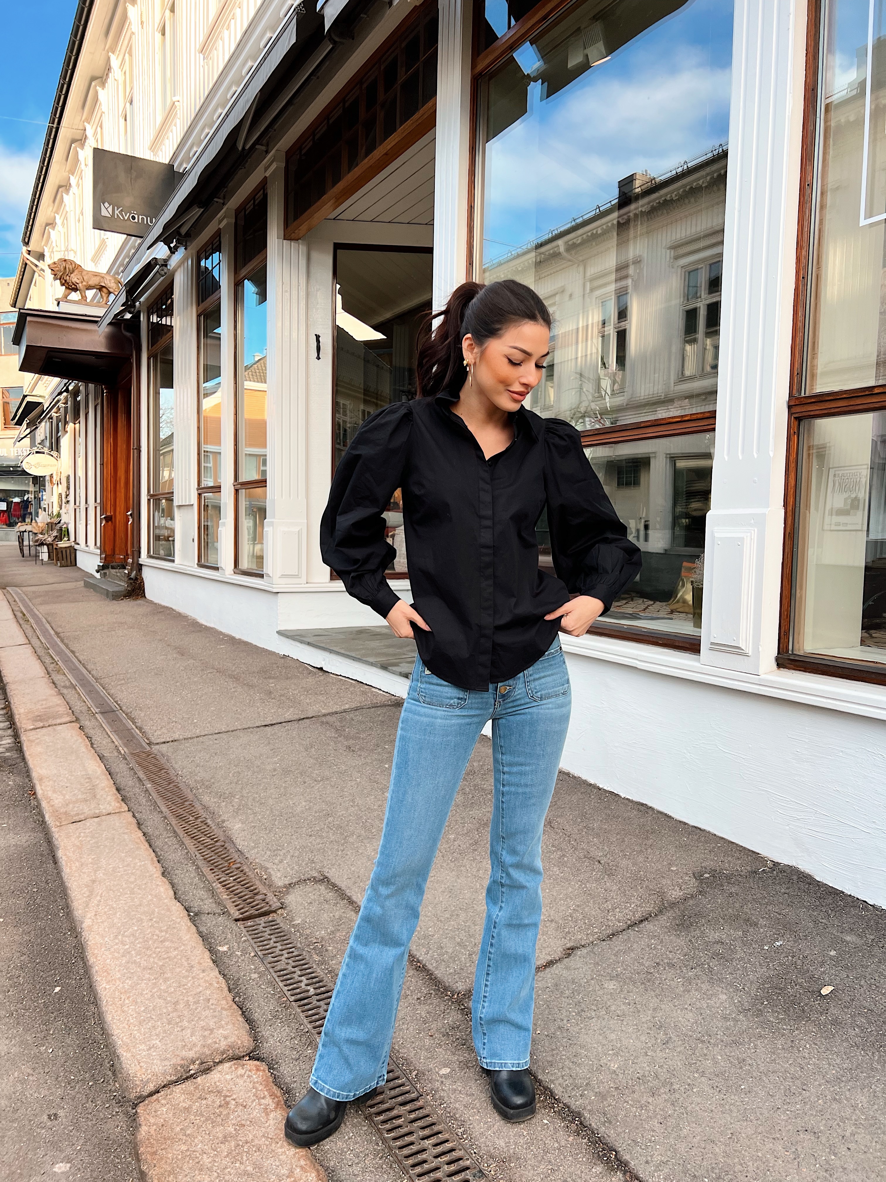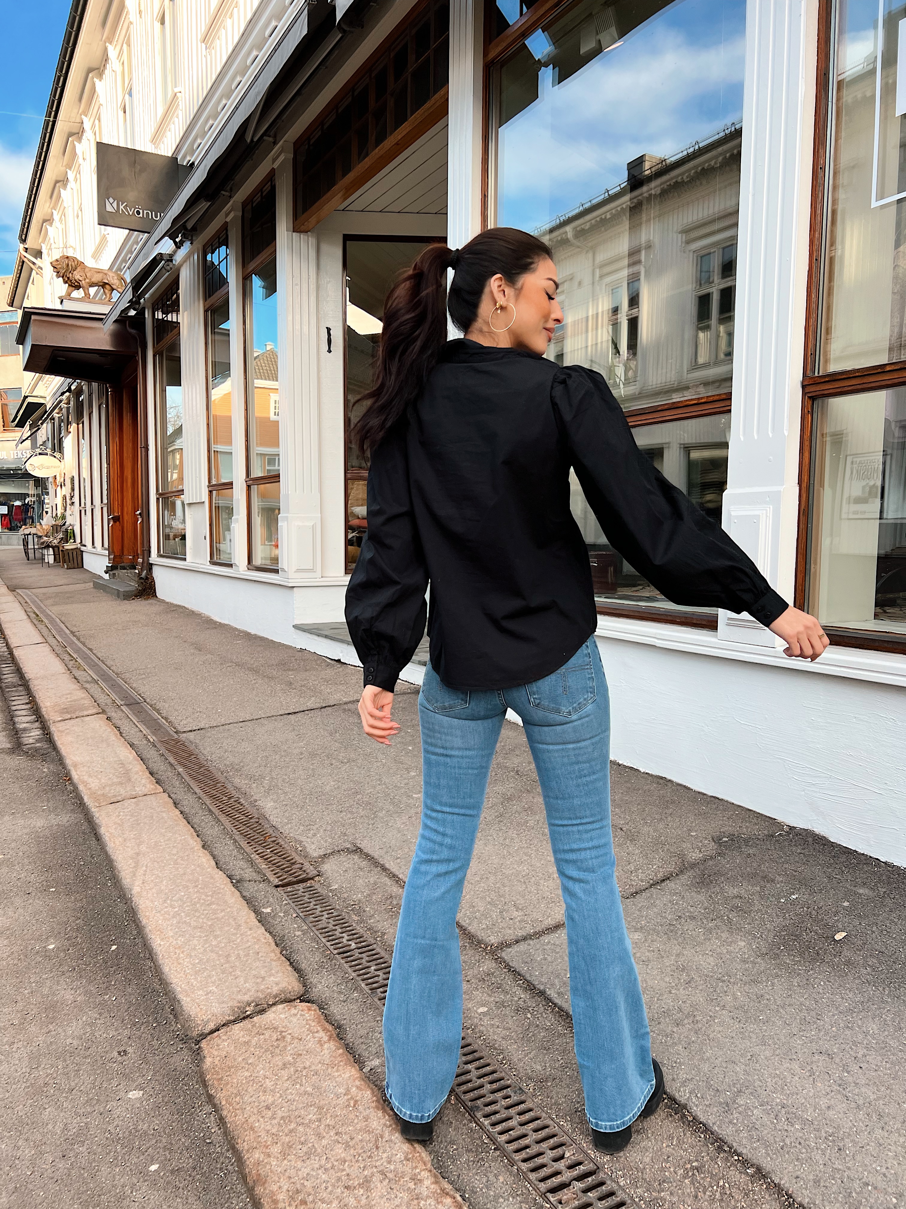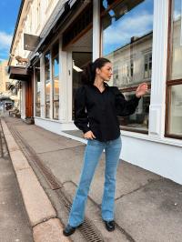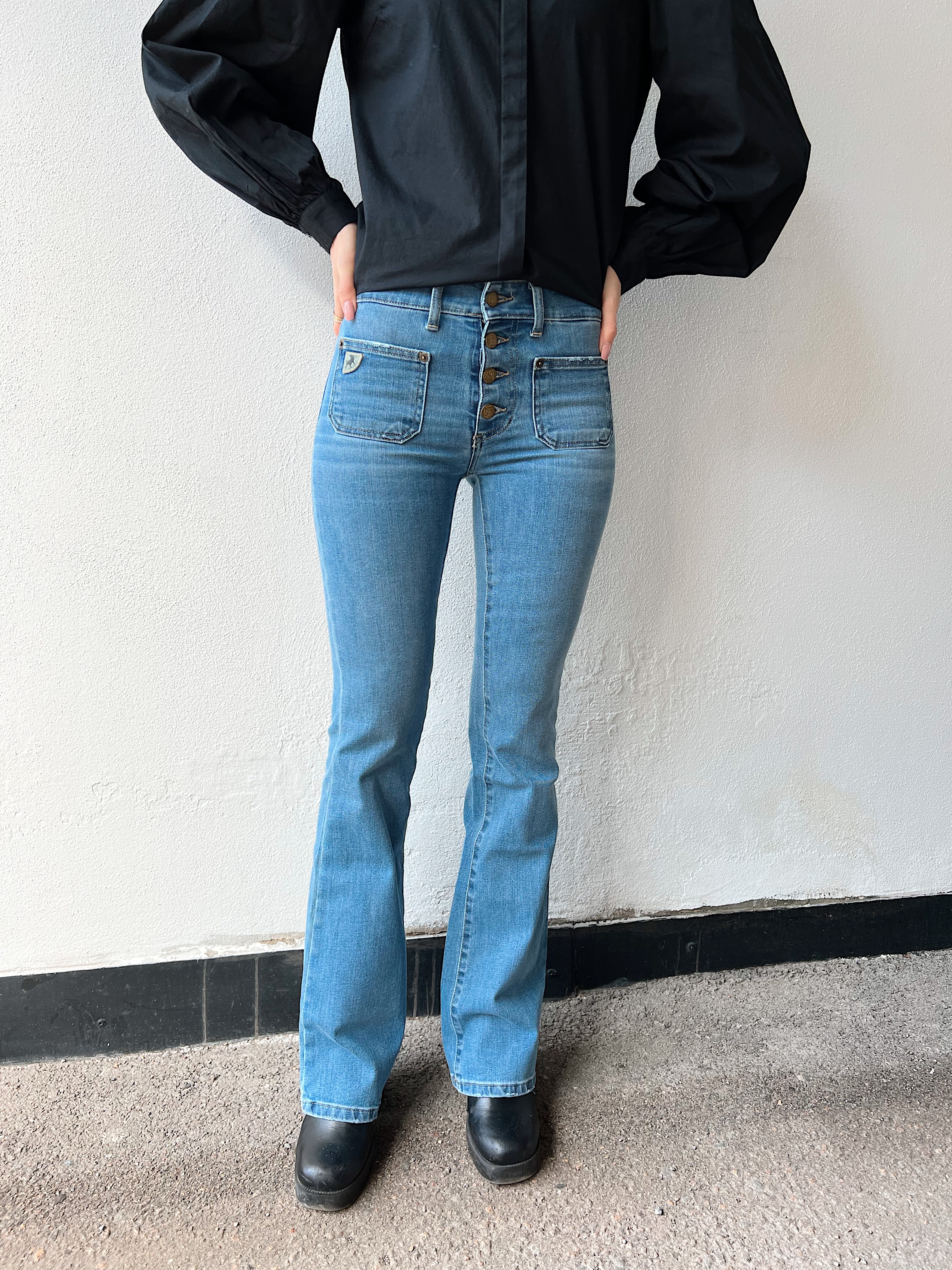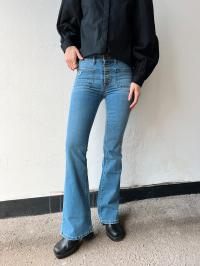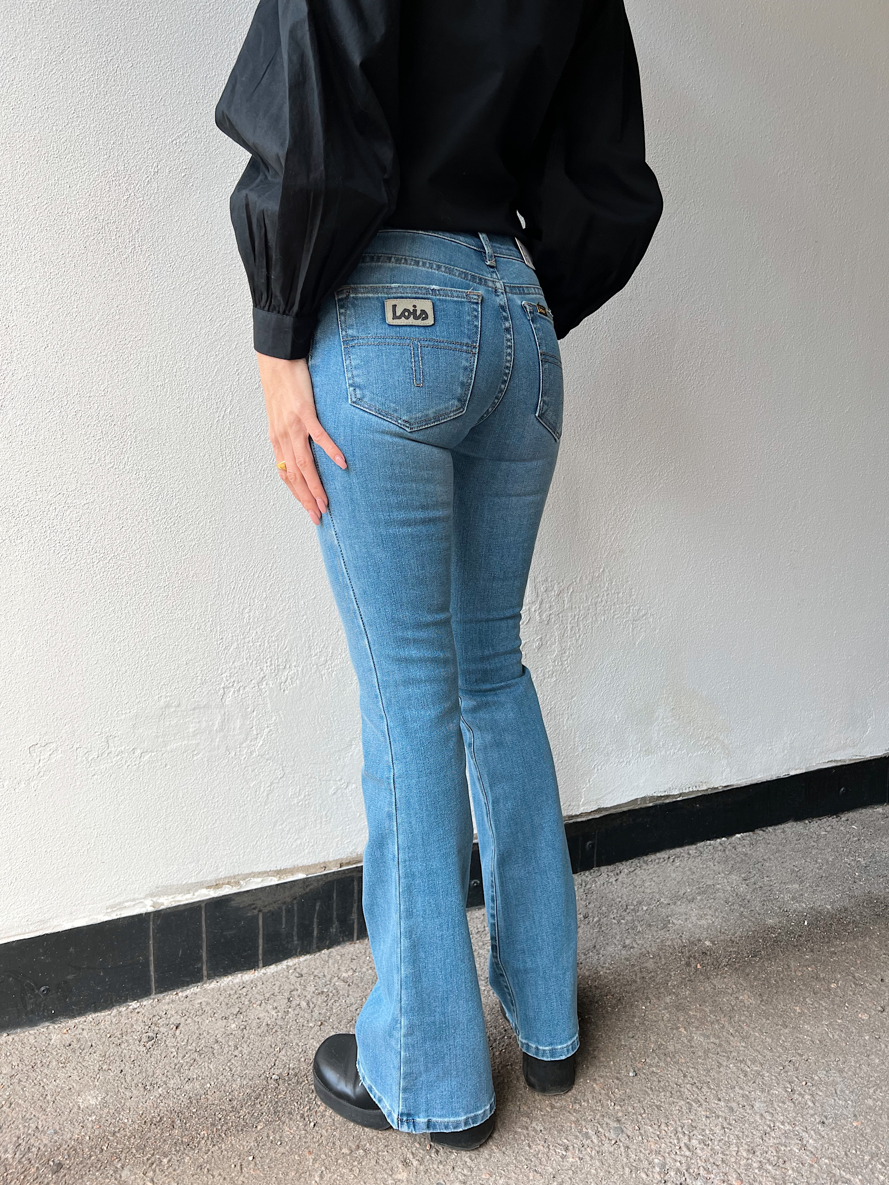 "Gaucho" fra Lois. Stilfull buksemodell fra Lois i klassisk blå. Gaucho har en komfortabel utforming med høyt liv, beltehemper og god stretch. Buksen har smal sleng i bena og er ettersittende over rumpe og lår for en flatterende passform. Lommer foran og lommer bak. Lukkes med knapp og glidelås i front.