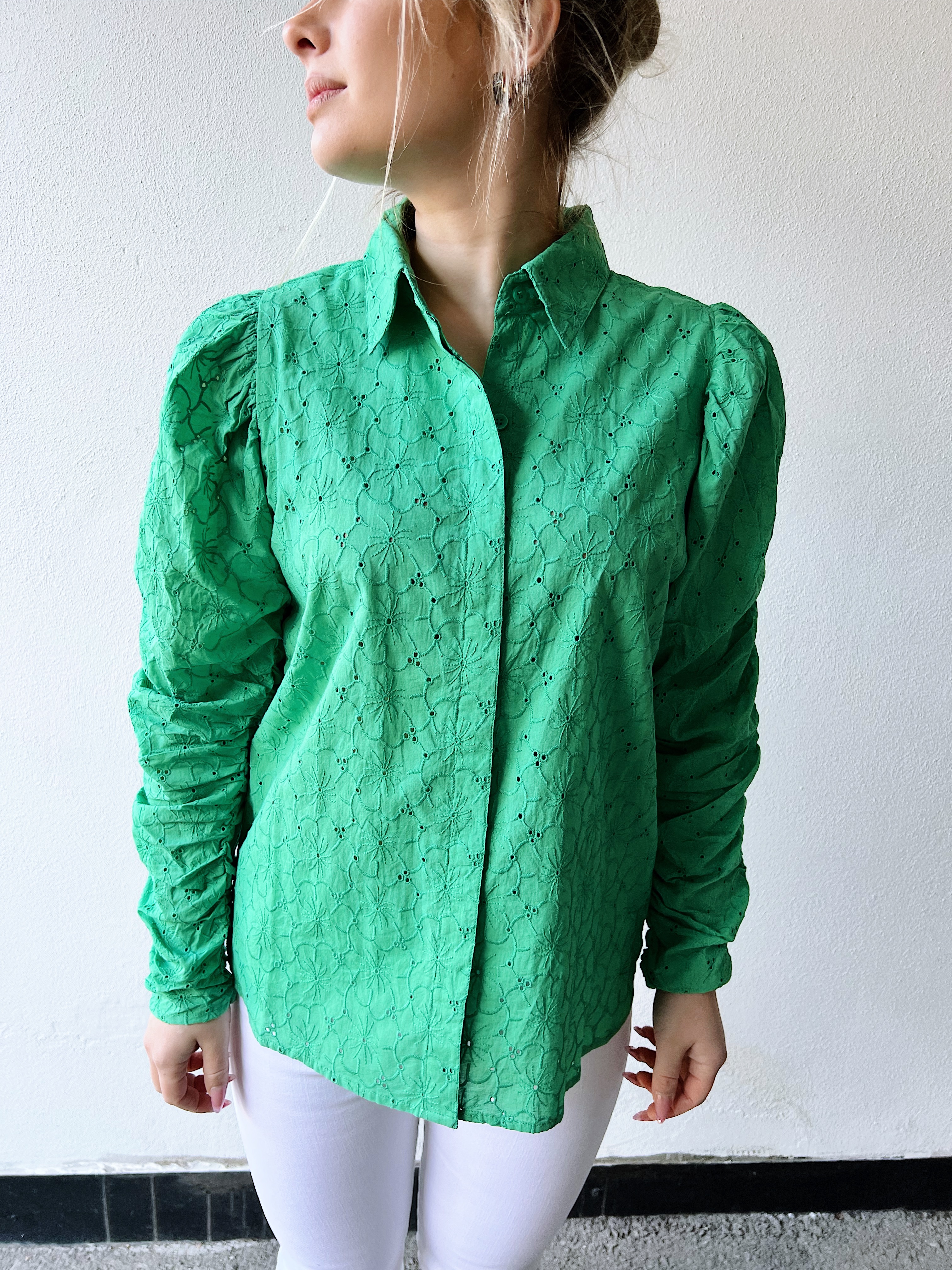 "Tina Blouse" fra MISSMAYA er en vakker skjorte i 100% delikat bomull med broderier fra MISSMAYA. Tina Shirt har en behagelig kvalitet med lekre puffermer og en fresh grønn farge. Like fin både oppi og utenfor en bukse eller skjørt.