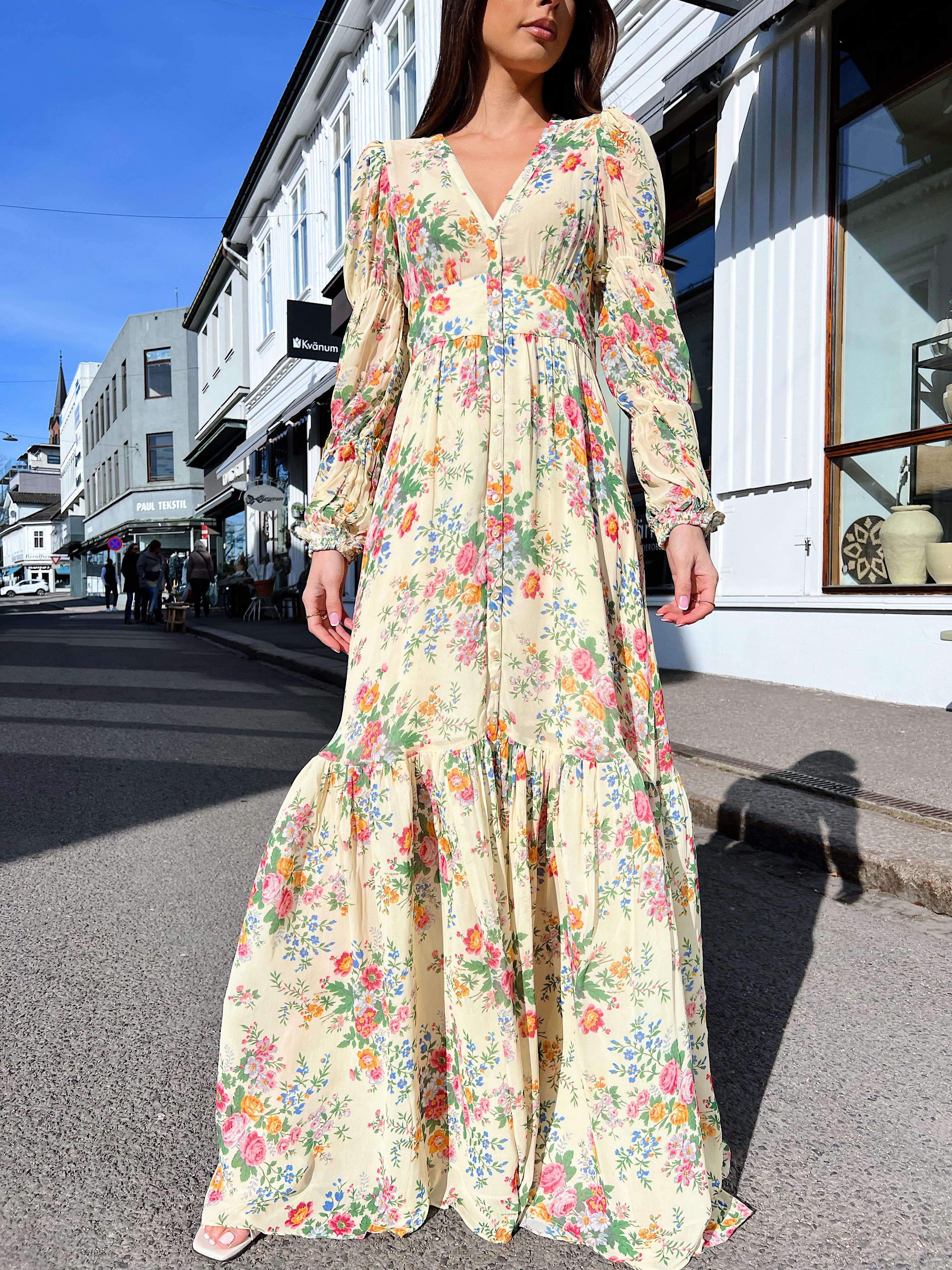 "Georgette maxi dress " fra byTiMo. Lang kjole med et perfekt snitt, v-hals og knepping foran. Bred innsving over midjen som gir en nydelig snitt. Lekre detaljer på ermene.