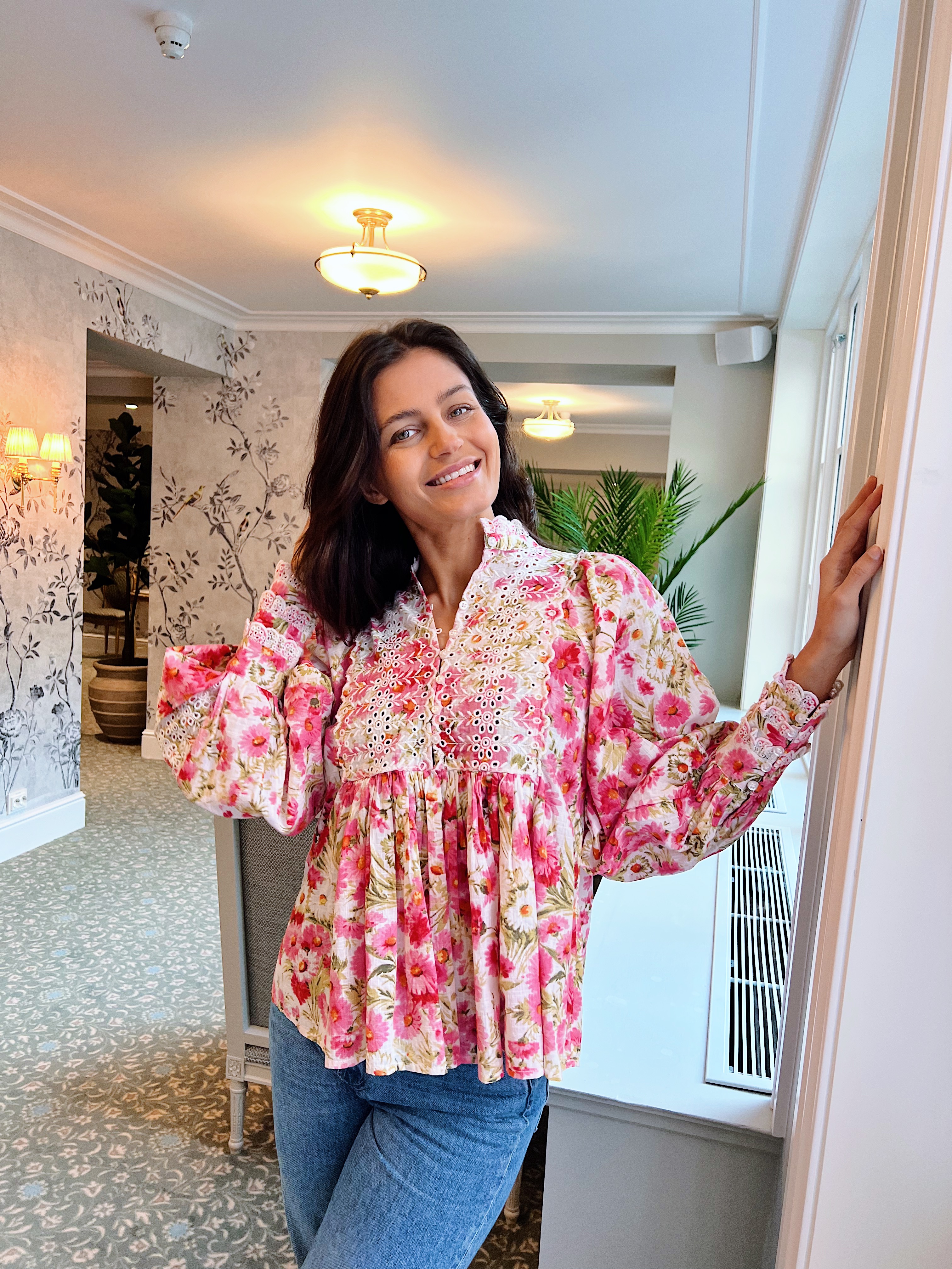"Cotton Slub Lace Blouse" fra byTiMo. Nydelig blondebluse i en tynn og lett bomullskvalitet. Ermene er oversized. Det er engelske blondedetaljer på ermene og brystet.