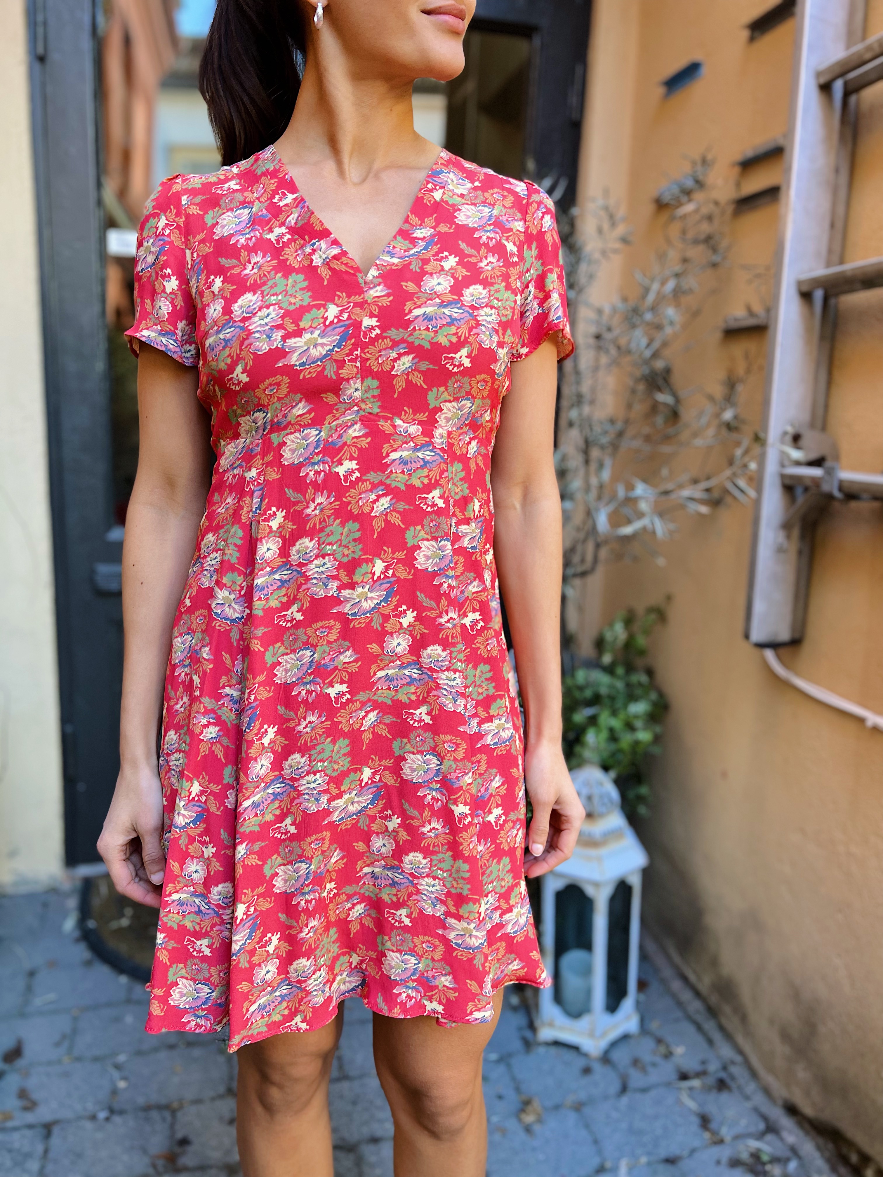 Nydelig kjole med v-hals, korte ermer og innsving i livet som passer de fleste! Kan lett bli dresset opp og ned etter anledning. Lukkes med skjult glidelås bak.