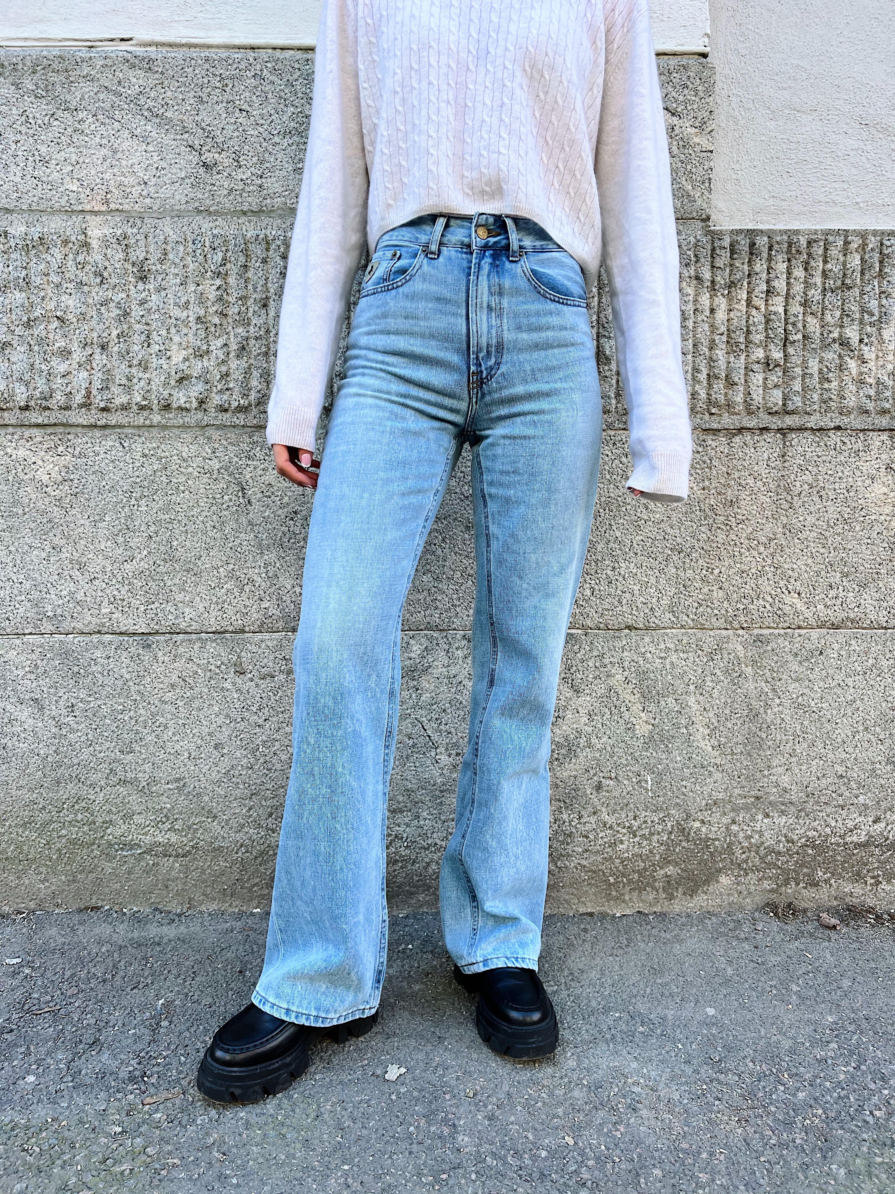 Denne jeansmodellen har høyt liv, vide bein og ingen stretch. Denne modellen er 90-tallsinspirert og tilhører "Antifit"-serien til Lois.