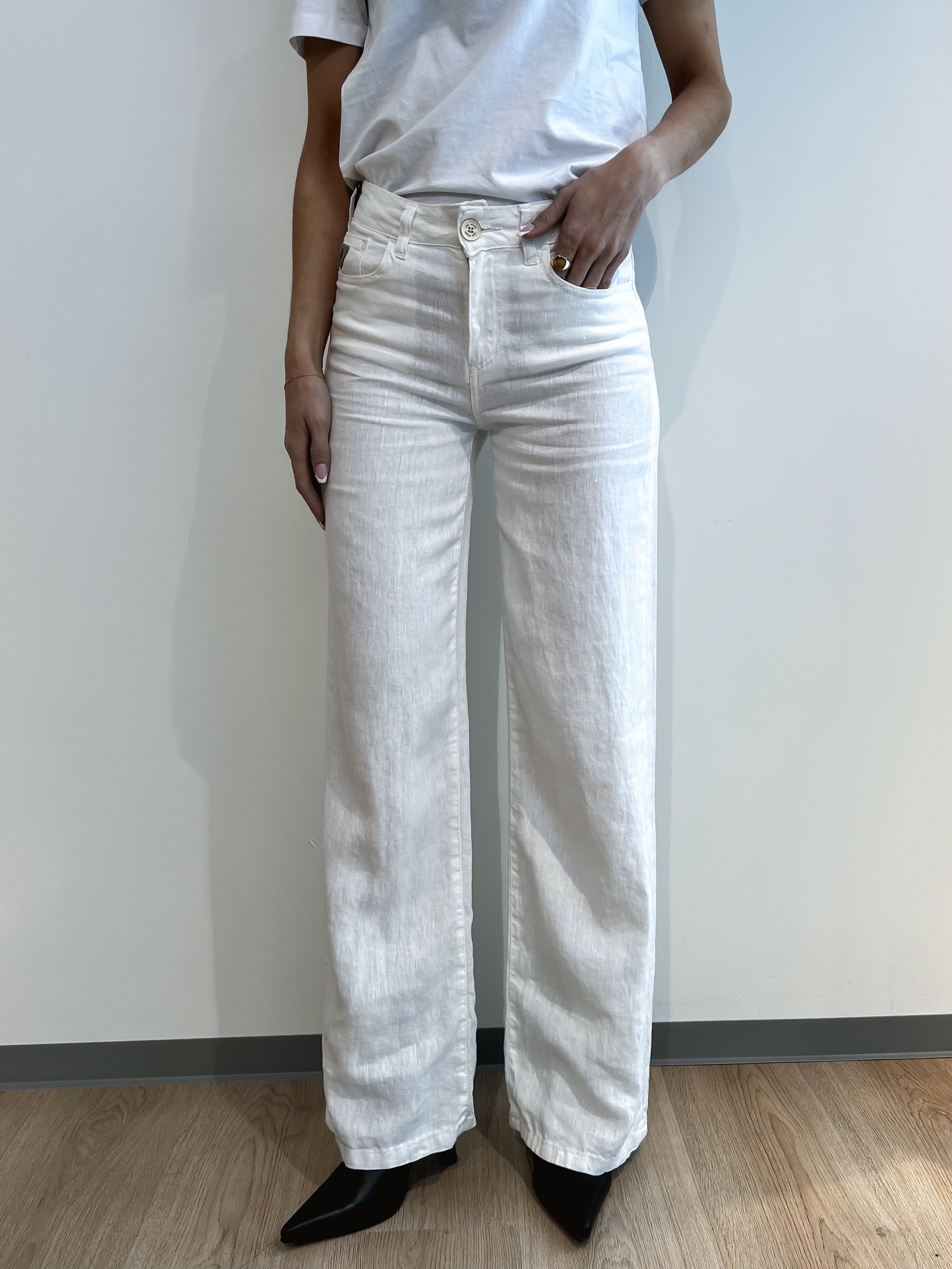 Denne jeansmodellen har høyt liv, vide bein og ingen stretch. De perfekte linbuksene!