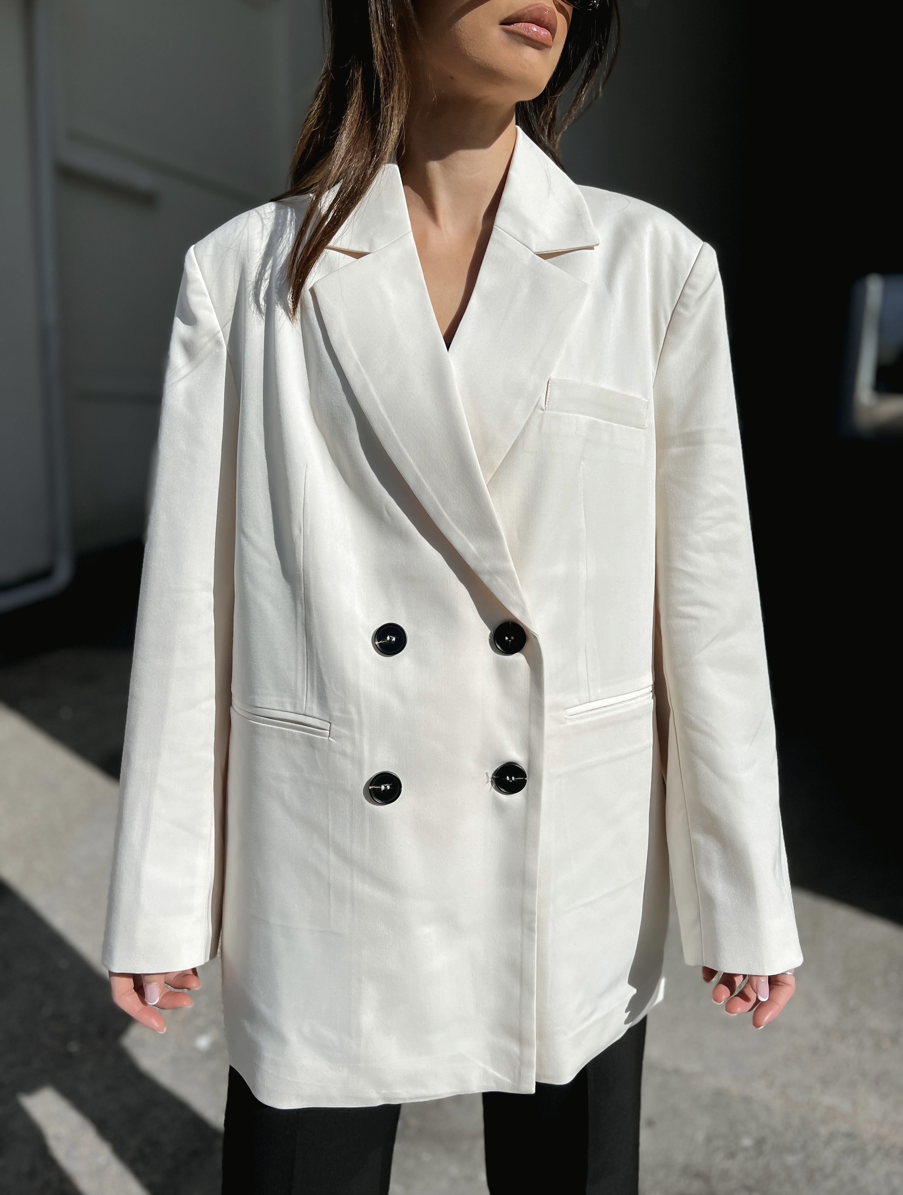 «Aza blazer» fra Yas. Stilig oversized blazer i en delikat eggeskallfarge. Blazeren har knepping i front med sorte knapper og lommer med klaff.