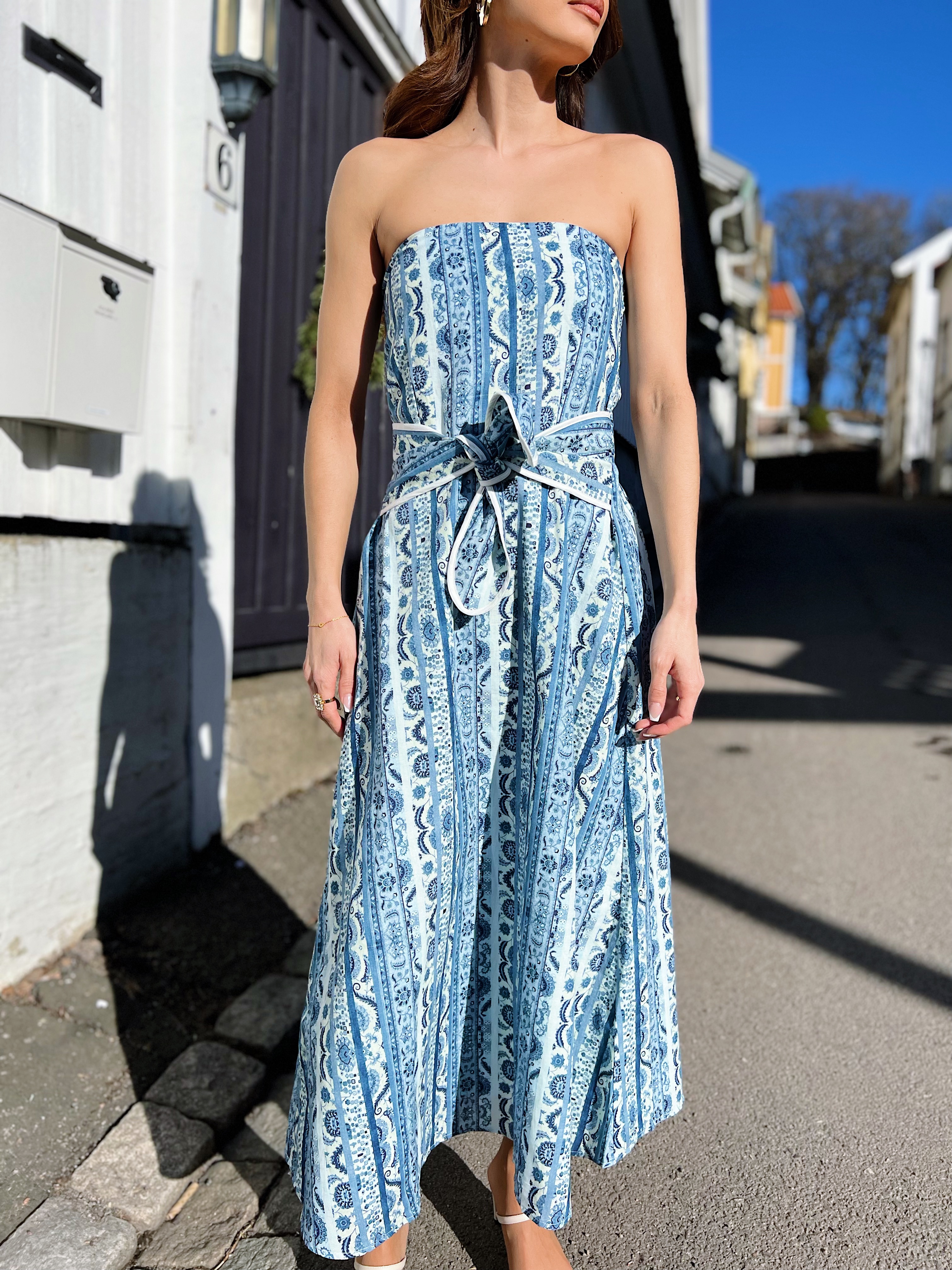 «Larsa maxi dress» fra Love Lolita. Larsa-kjolen er perfekt til feriegarderoben din eller sommerfest! Den har belte i midjen som kan knytes både foran og bak. Kjolen er laget i mykt og flytende materiale som holder deg kjølig på varme sommerdager. Style den med favorittsandalene dine for en enkel look.