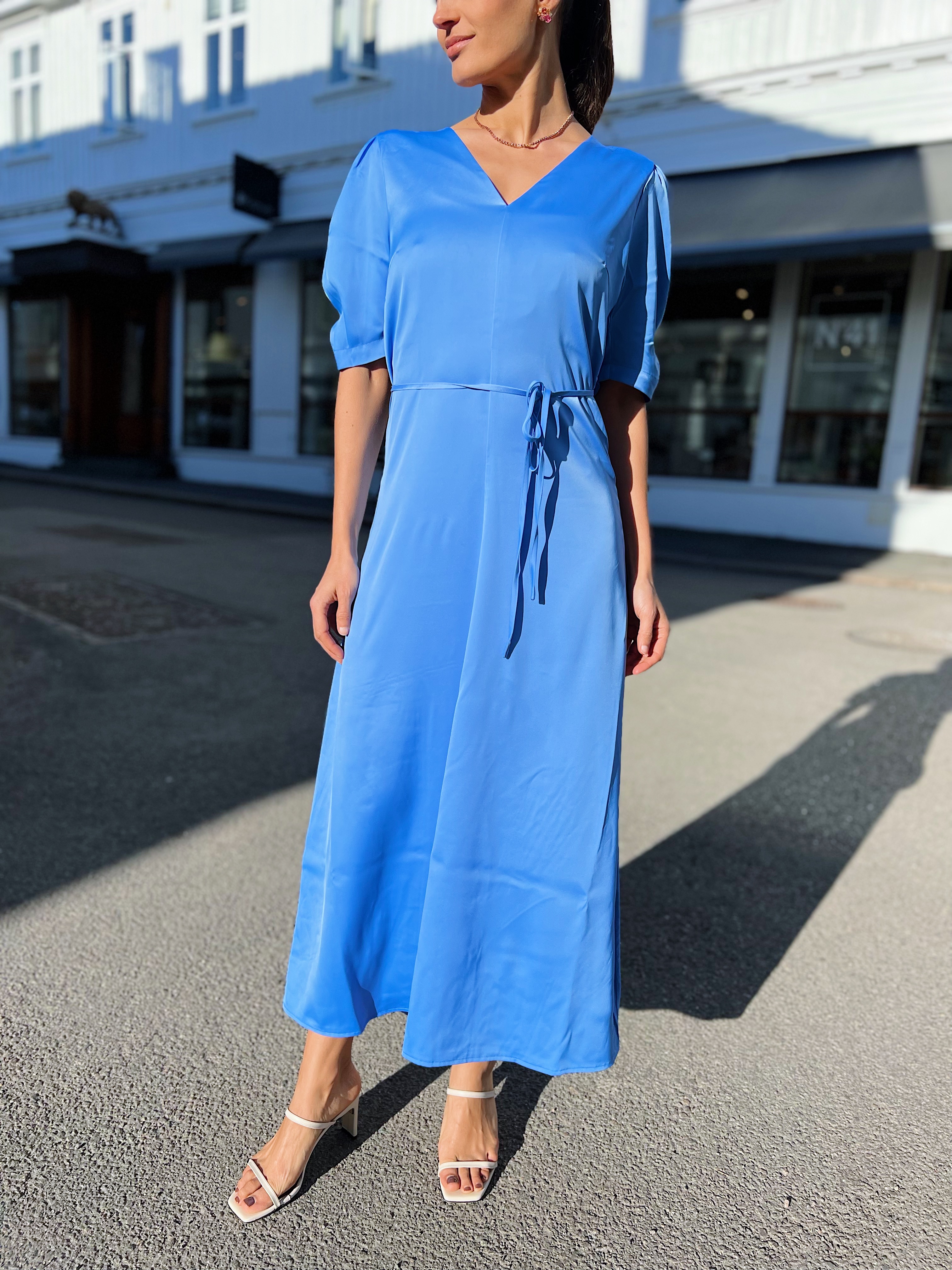 «Rachelle 2/4 ankle dress» fra Selected Femme. Vakker sateng kjole i nydelig blåfarge. Kjolen har v-hals og kort erm. Knyting i midjen.