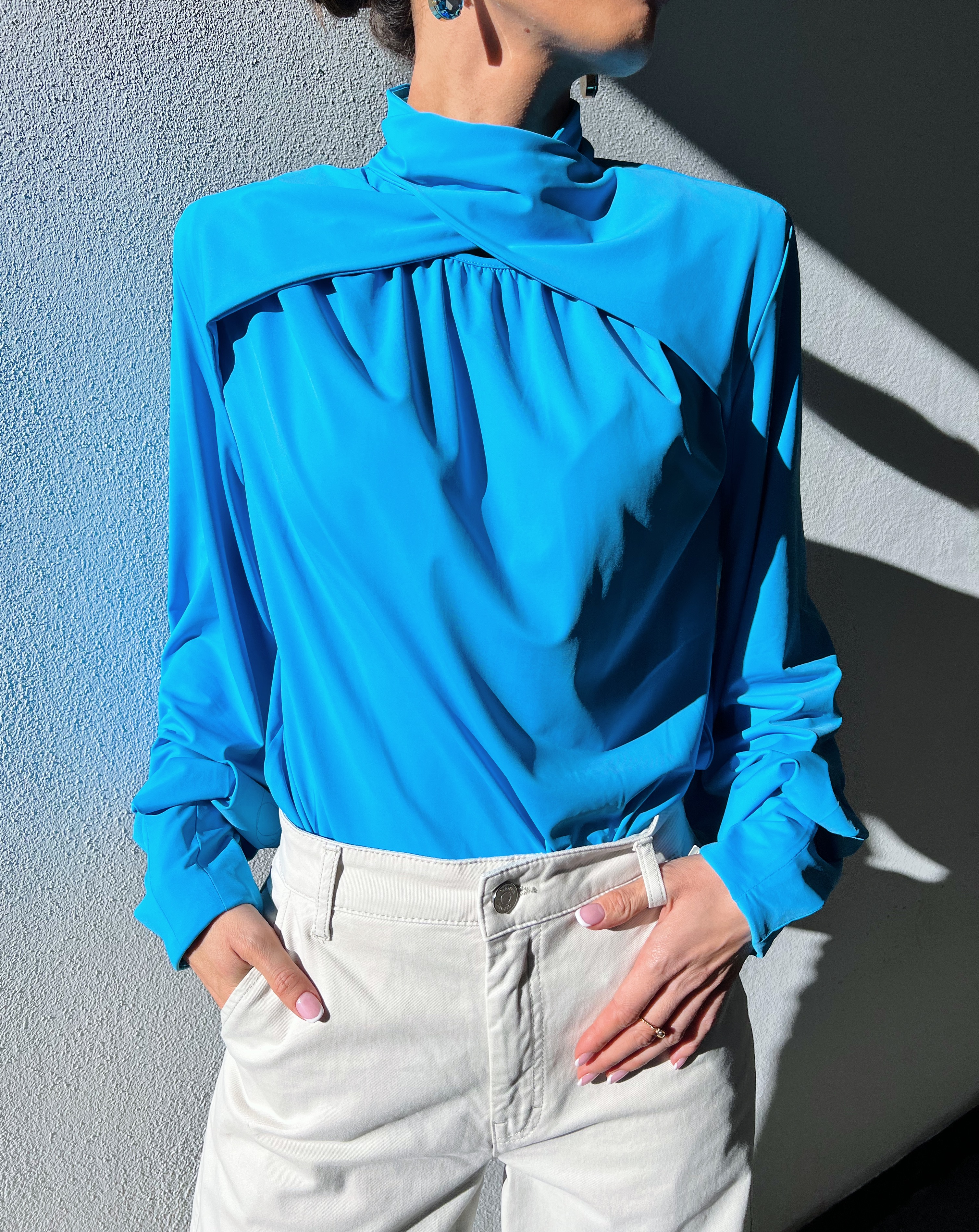 «Solia is body» fra Gestuz. En figursydd langermet body i en unik konstruksjon med en oversized bluse-inspirert overdel. Med korsdesign og rynket kant på brystet, turtleneck, skulderputer, glidelås bak og biskopermer med tilpassede mansjetter. Laget med resirkulerte materialer.