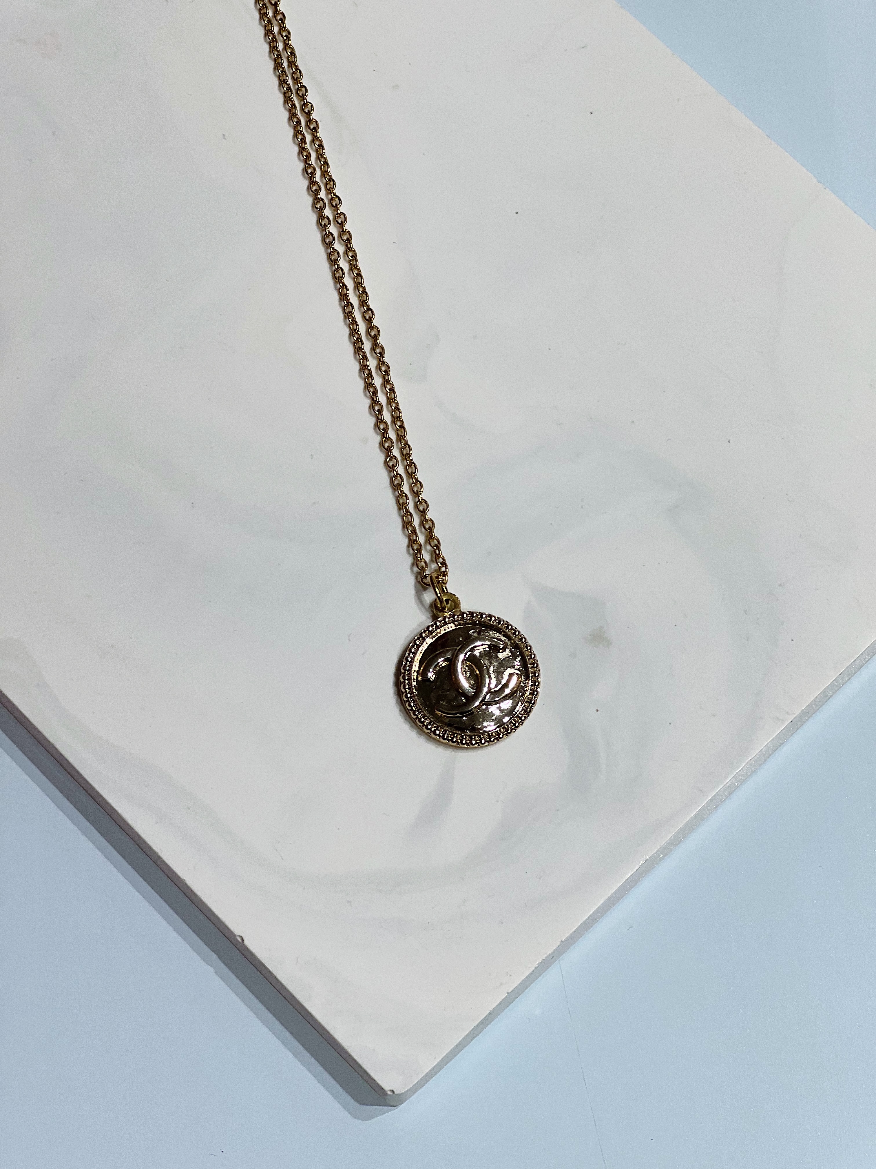 Unik, vintage designerknapp som er gjort om til et smykke! Lekker gullfarget anheng med Chanel logo og lenke. Svært begrenset opplag. Lenke og lås er laget av gullbelagt messing og er nikkelfritt. Knappene er vintage og med nikkelfri bakplate.