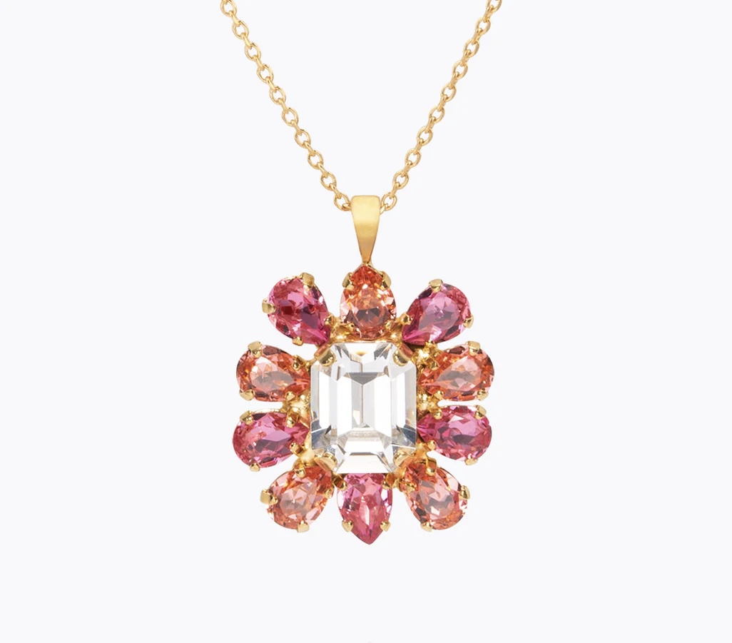 «Peony necklace gold» fra Caroline Svedbom. Dette praktfulle kjedet har et blomsterformet design med høykvalitetskrystaller. Match med Peony øredobber og Peony Ring for en komplett look. T