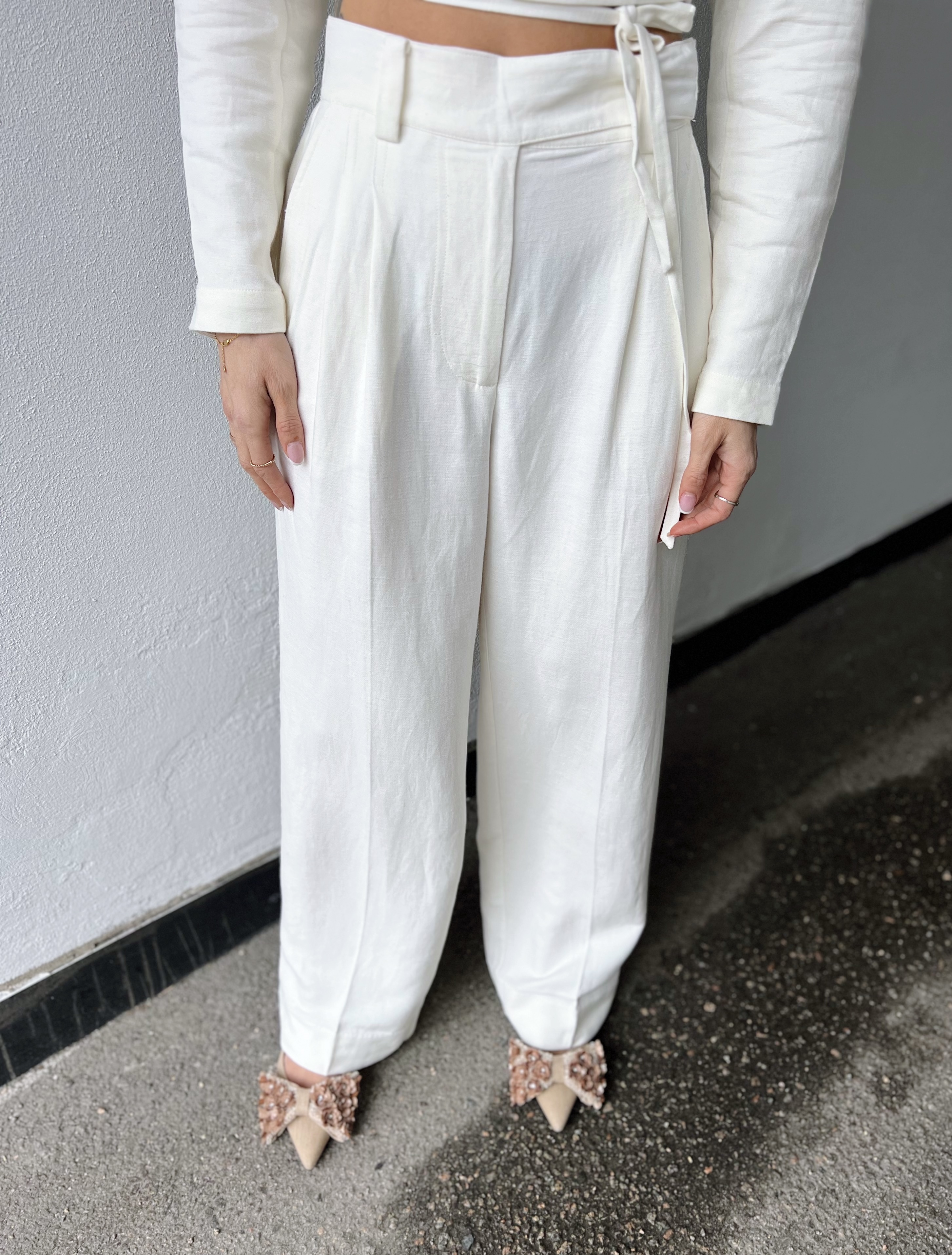 «Lino troursers» fra Second Female. Elegant bukser med vidde ben. Laget i et lett og glatt stoff med linstruktur. Med knapp, krok og skjult glidelås. Elastisk strikk bak. To skrå lommer og to dekorative lommer bak. Plisserte detaljer i linningen. Figursydd midje og brede, rette ben. Matcher perfekt sammen med «Lino cropped shirt».