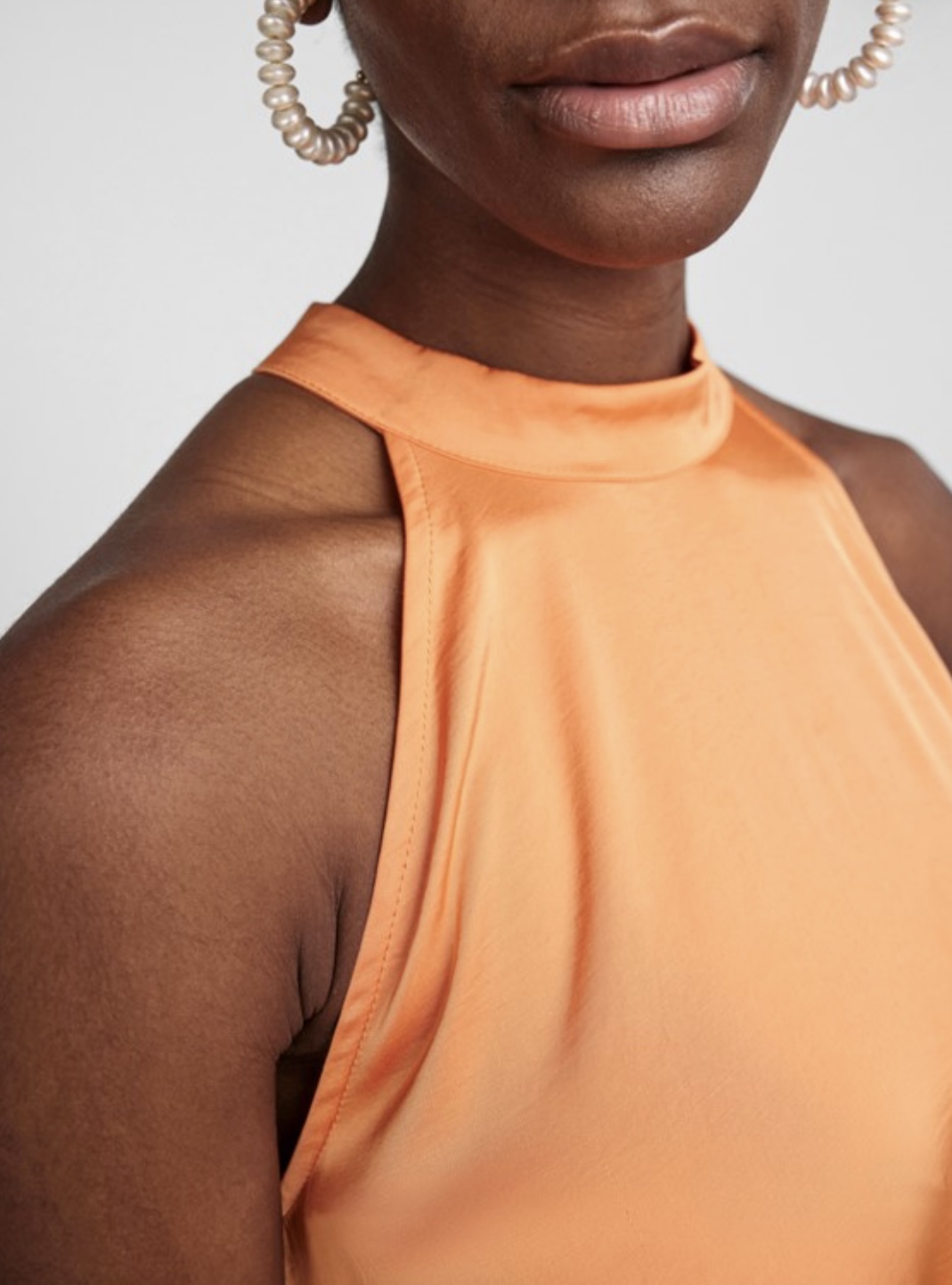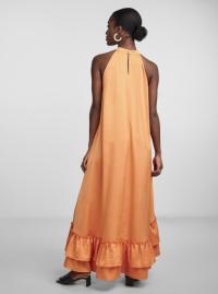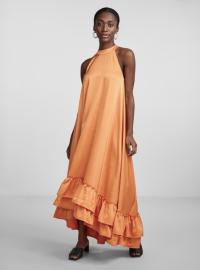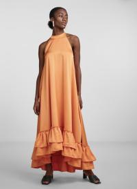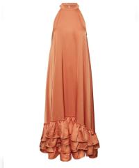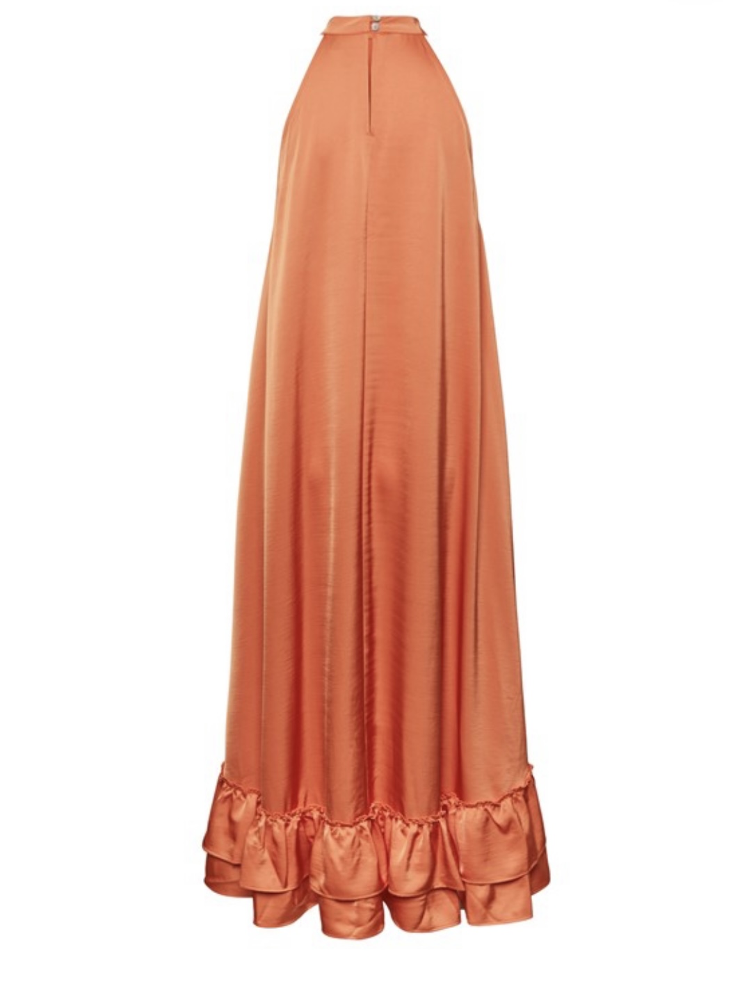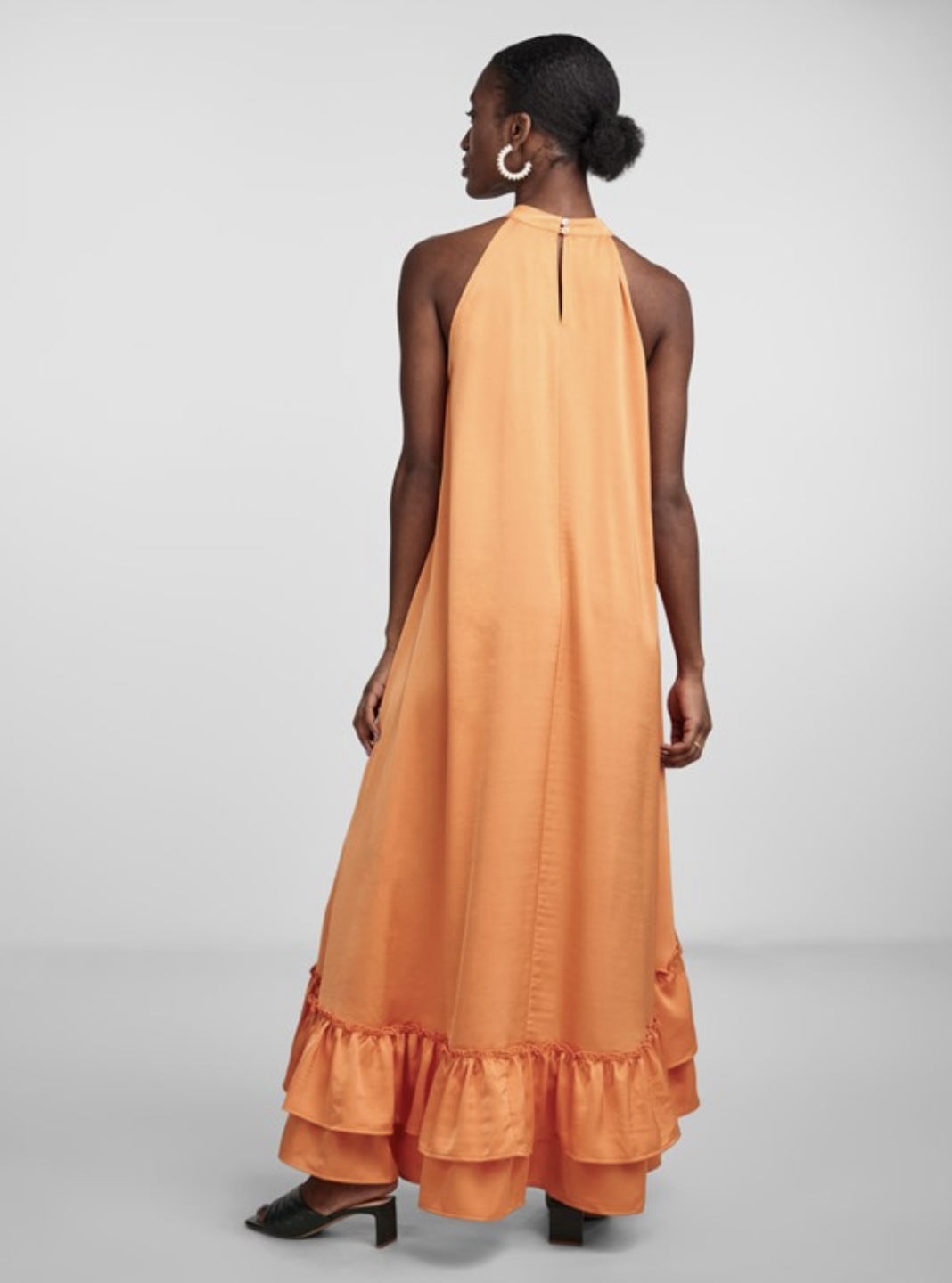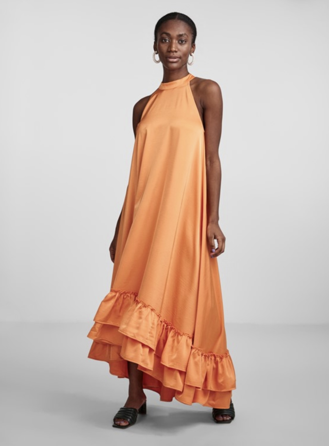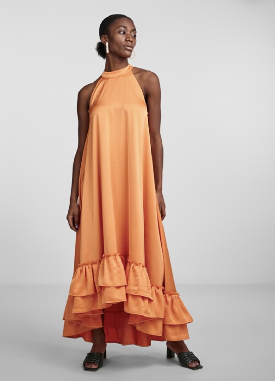 «Eleanor halterneck long dress» fra Yas. Rålekker lang kjole i glatt og shiny kvalitet. Kjolen har rund hals og har lag av volangkanter nederst på skjørtet. Lukkes med knapper.
