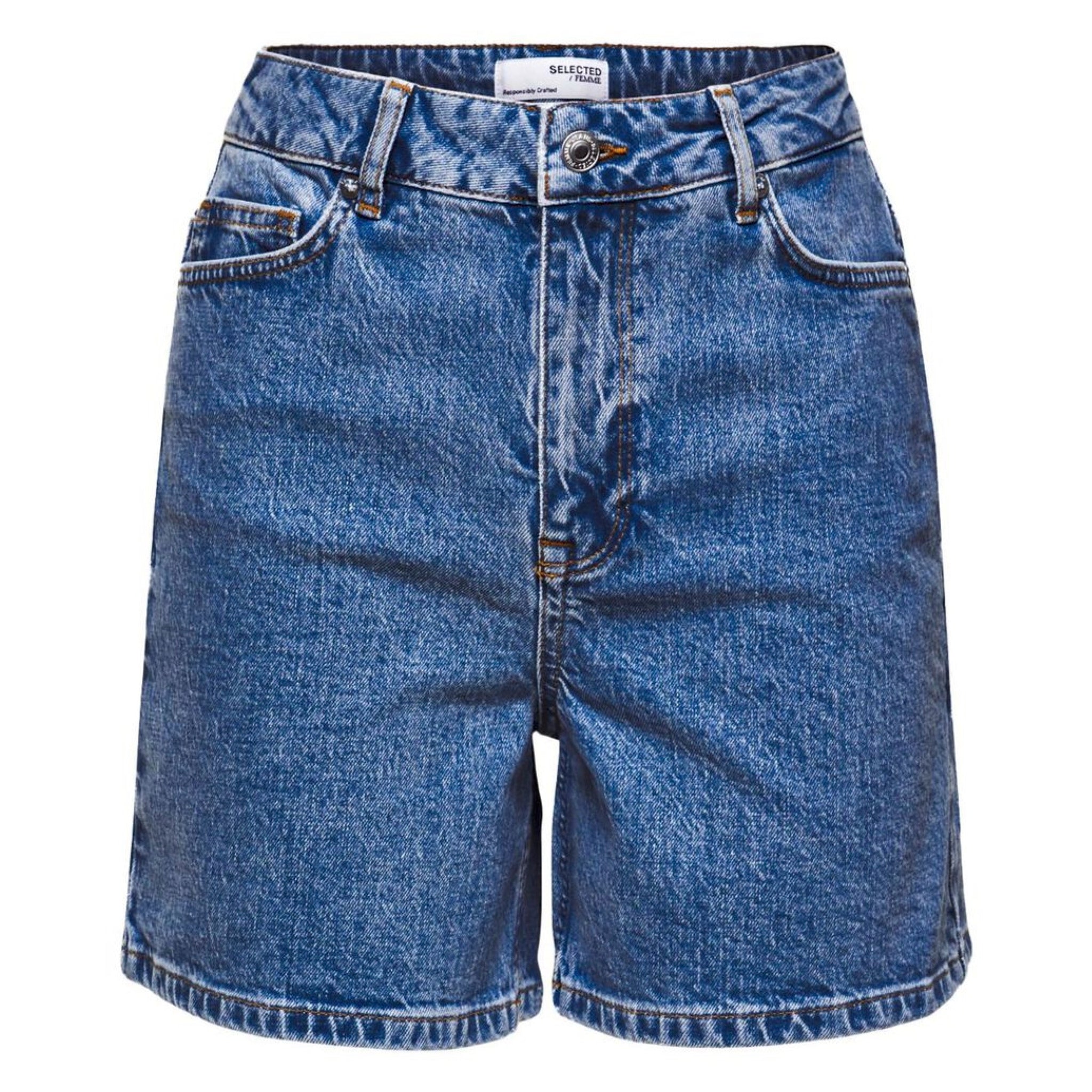 «Krista light blue denim shorts» fra Selected Femme er en klassisk denim shorts i lysblå vask. Shortsen lukkes med knapp foran. Shortsen har litt lengde og er viere og gir en avslappet følelse. Shortsen er høy i livet.