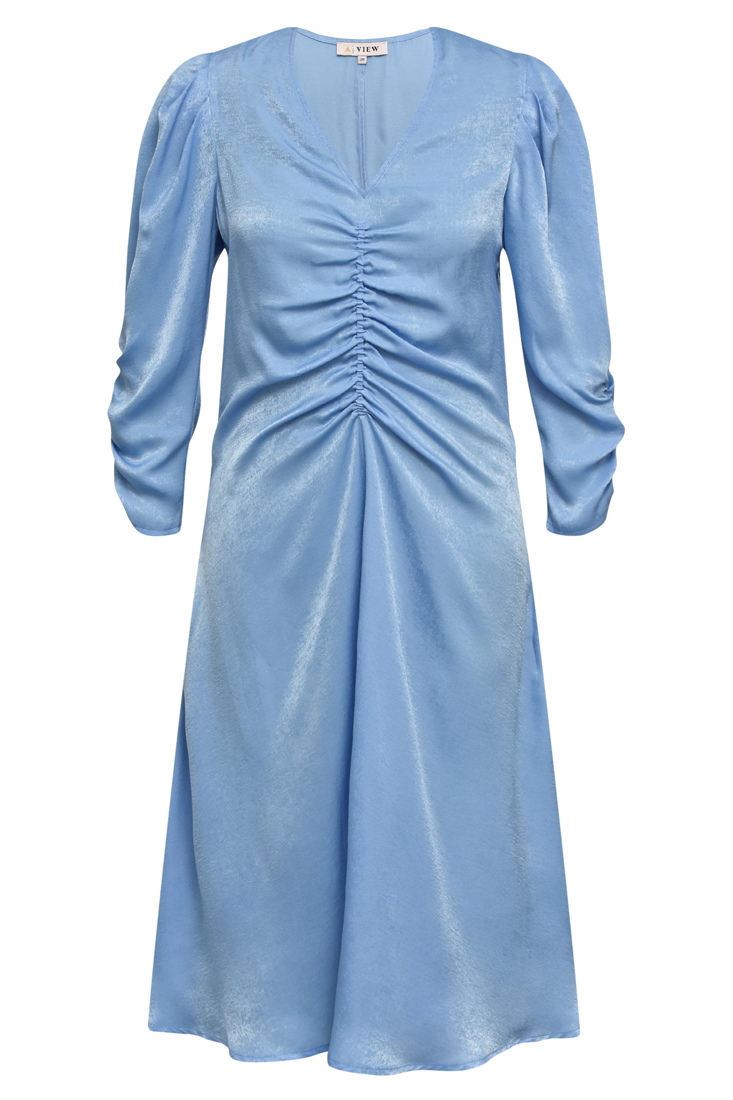 Evi kjole er en feminin kjole i en nydelig blå farge. Kjolen har 3/4-ermer, med fine ruching-detaljer og V-hals. Kjolen er normal i størrelsen.