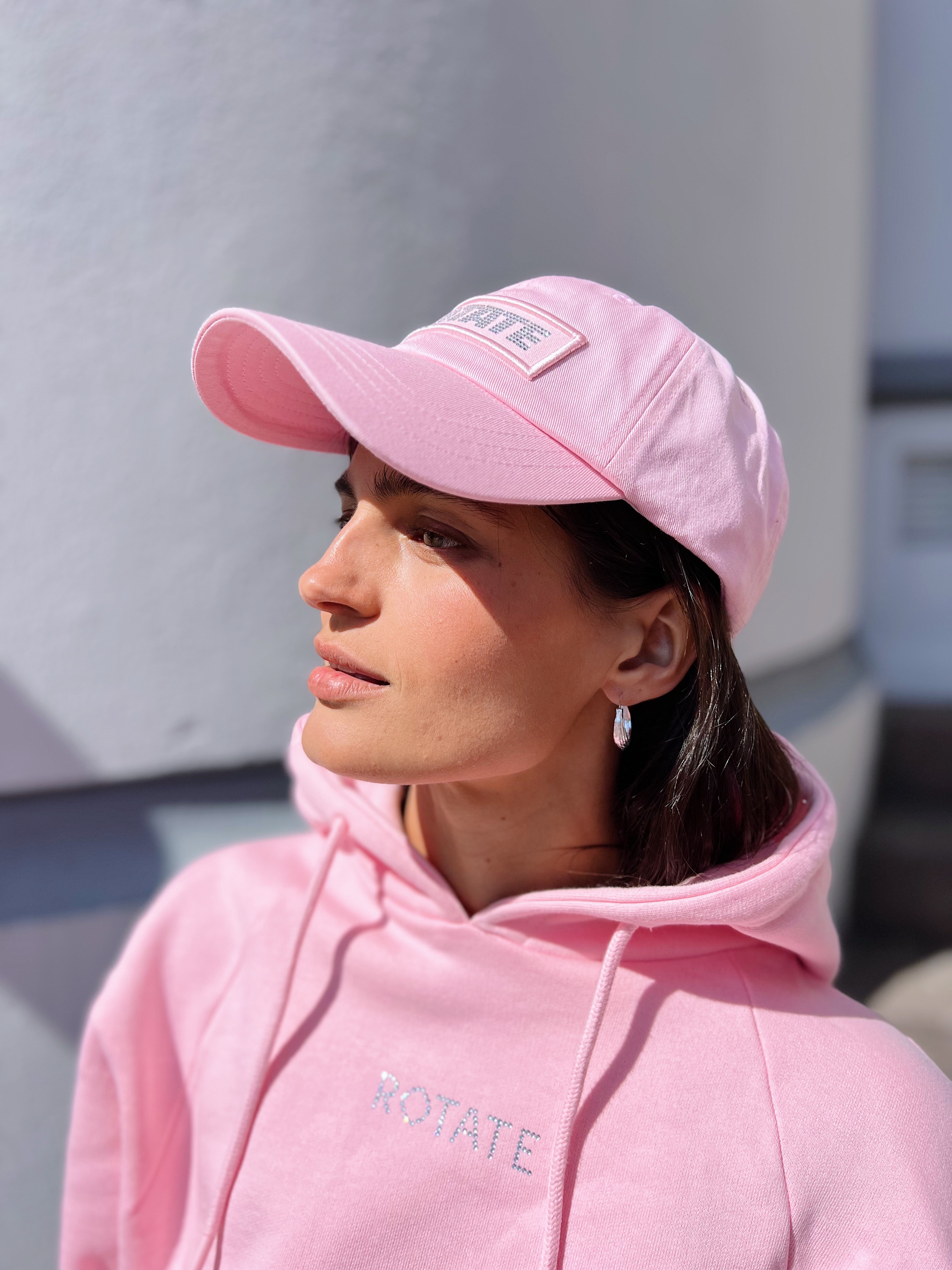 «Regular cap whit logo» fra Rotate. Denne kule capsen er laget av 100 % økologisk bomull. Den har justerbar rygglukking og visir. Capsen har ROTATE logo brodert foran med glitter effekt.