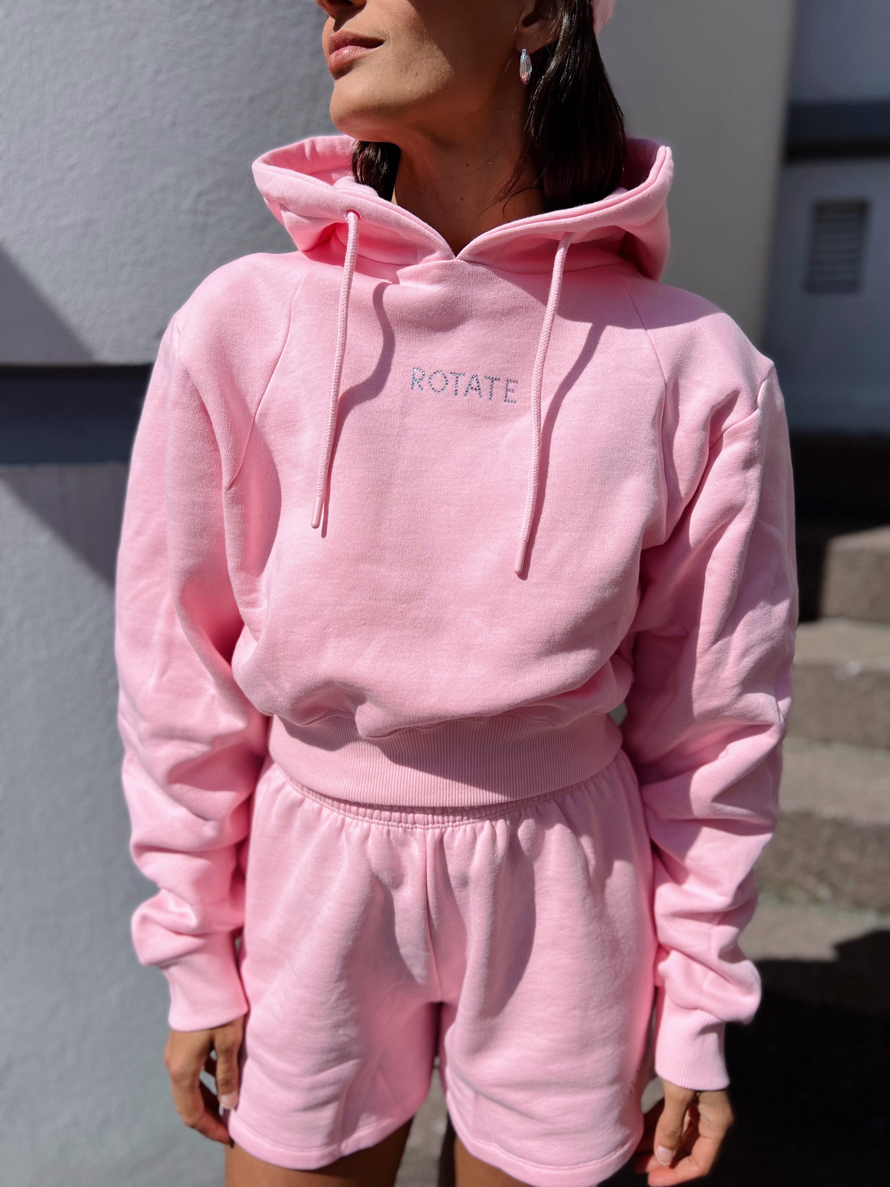 «Sweat cropped hoodie» fra Rotate er en cropped hoodie genser med brodert «ROTATE» logo foran med glitter effekt. Matcher perfekt sammen med «Sweat elasticated shorts»