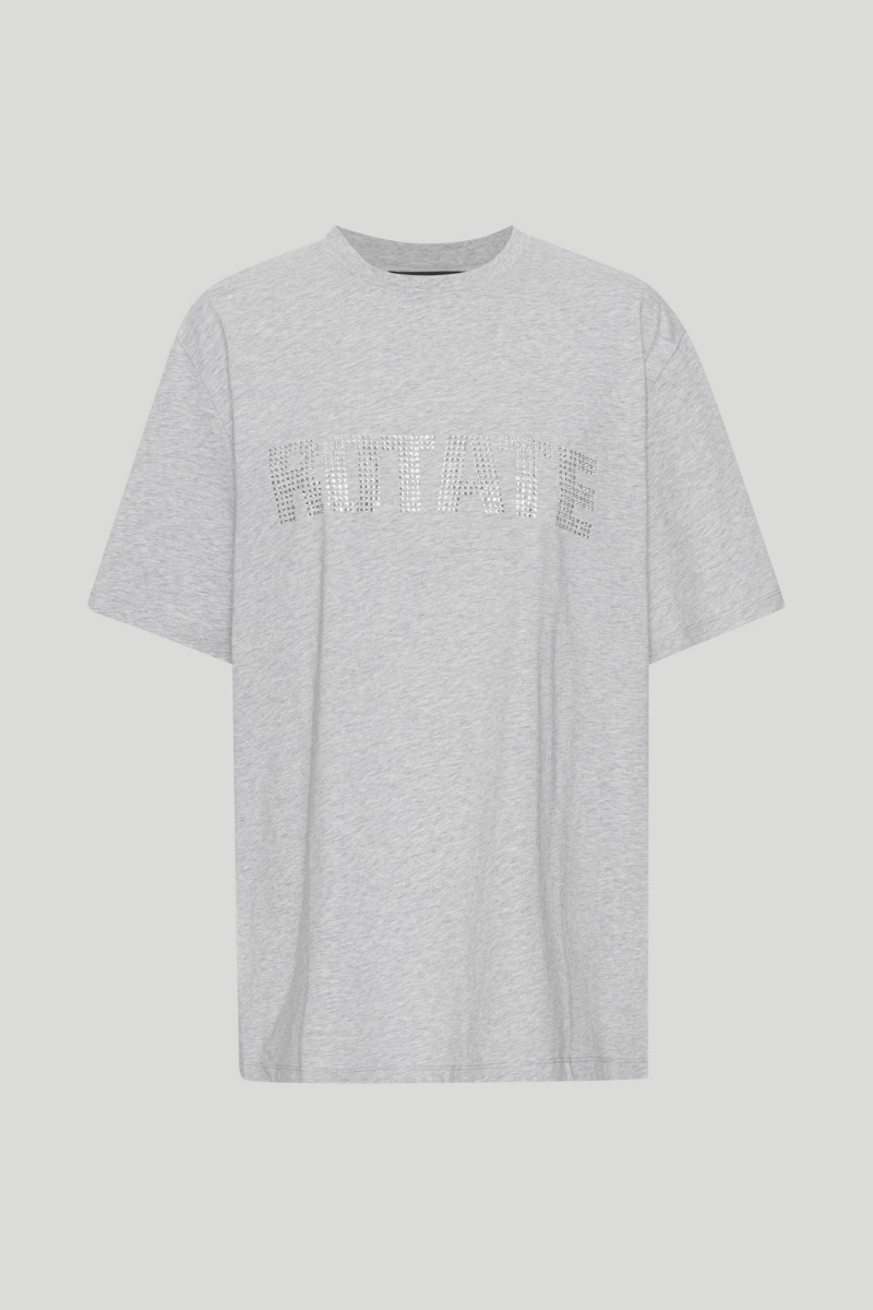 «Jersey stright t-shirt» fra Rotate er en lang oversized t-skjorte med brodert «ROTATE» logo med glitter effekt foran.