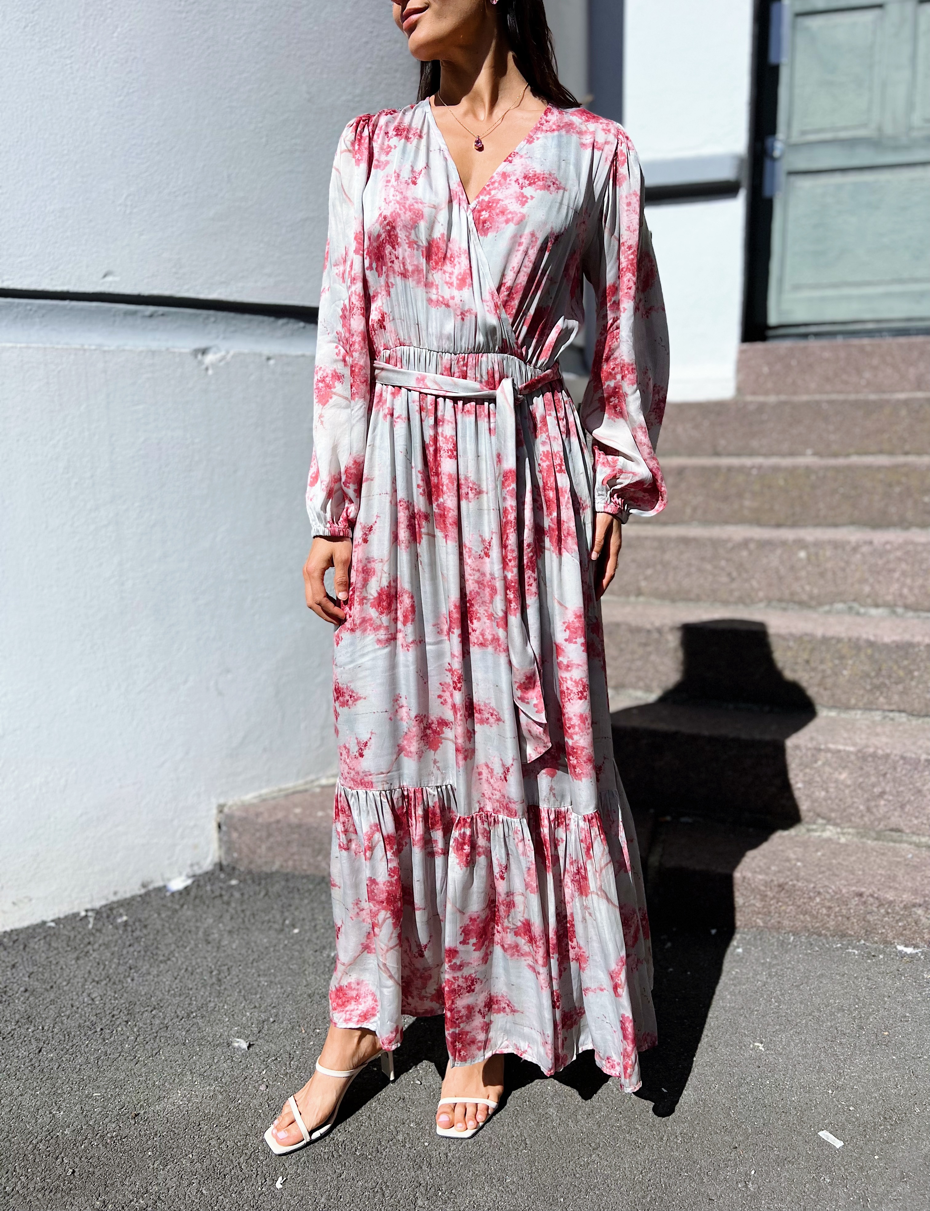 «Ingrid maxi dress» fra MISSMAYA. Vakker maxi-kjole med en "fake" wrap og lange ermer. Ingrid Maxi har strikk i livet som gir et flatterende snitt og avtagbart belte. Strikk i mansjett. Kjolen passer perfekt til vårens og sommerens festligheter og bryllup.