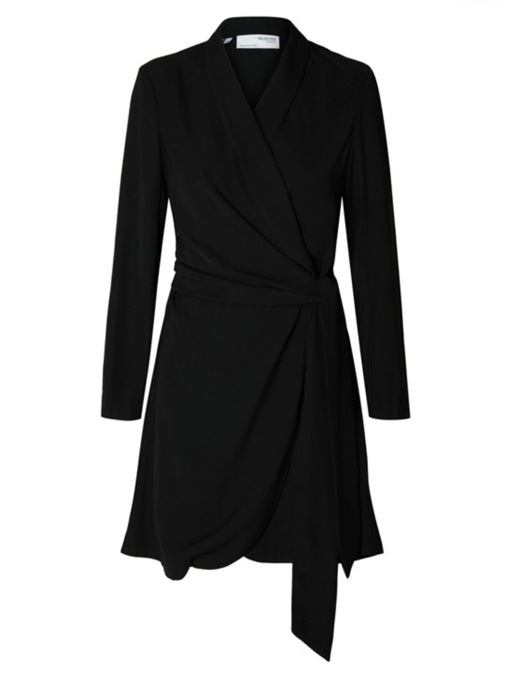 «Patricia short wrap dress» fra Selected Femme. er en nydelig og feminin omslagskjole i sort. Kjolen har v-hals og lange ermer. Lukkes med knyting på siden.