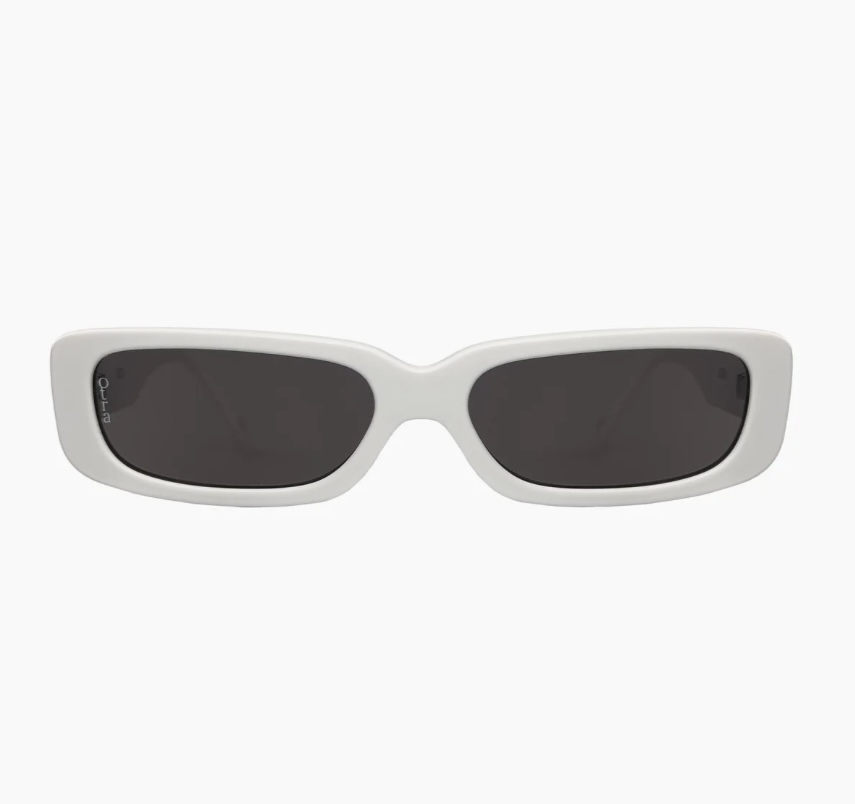 «Sunny» fra Otra. Smale rektangulære solbriller i hvit.