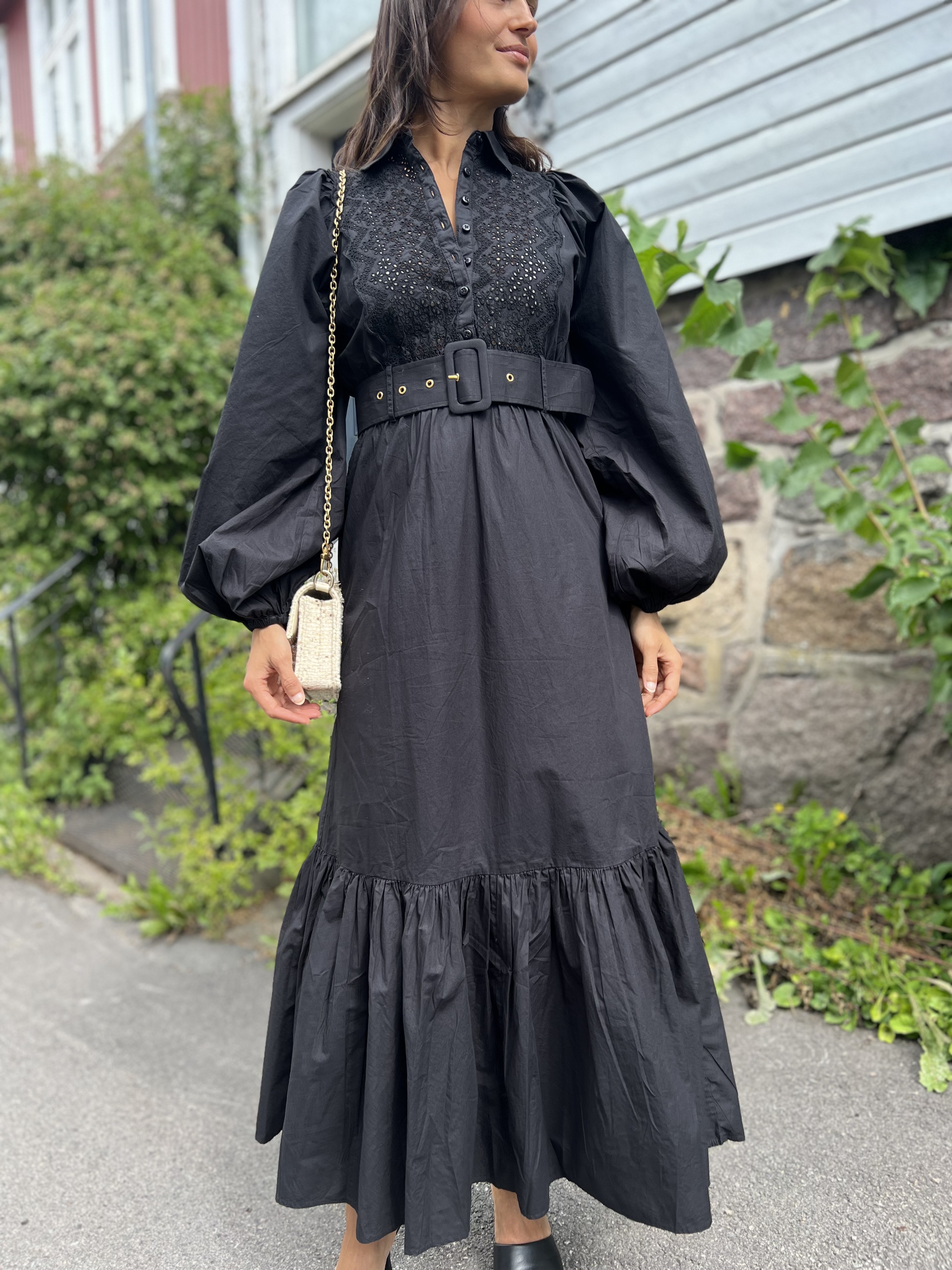 The Dècorated Poplin Dress" fra byTimo i midilengde er laget av myk og crispy GOTS-sertifiserte bomullskvalitet. Kjolen har oversized, vintage-inspirerte ermer og er prydet med broderie anglaise-detaljer på brystet, ermene, mansjettene og utringningen. Kjolen har krave og knepping hele veien ned. Den har et avtagbart belte.
