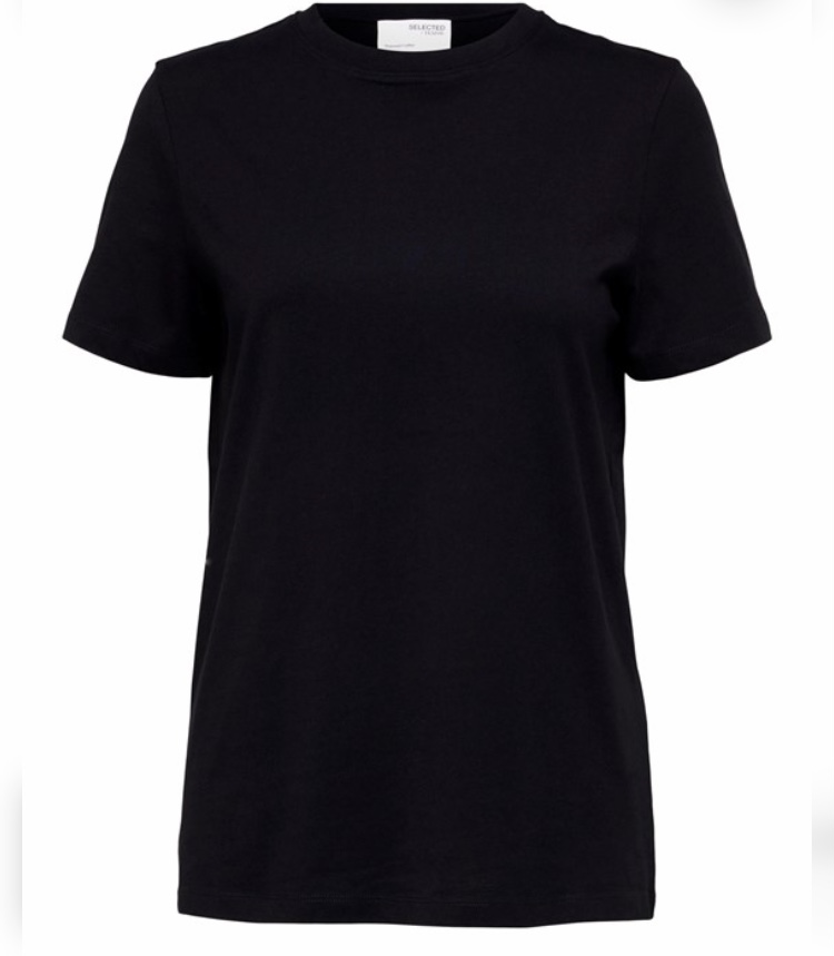 «Myessential o-neck» fra Selected Femme. Deilig og klassisk t-skjorte, solid økologisk bomull. Rund hals og korte ermer.