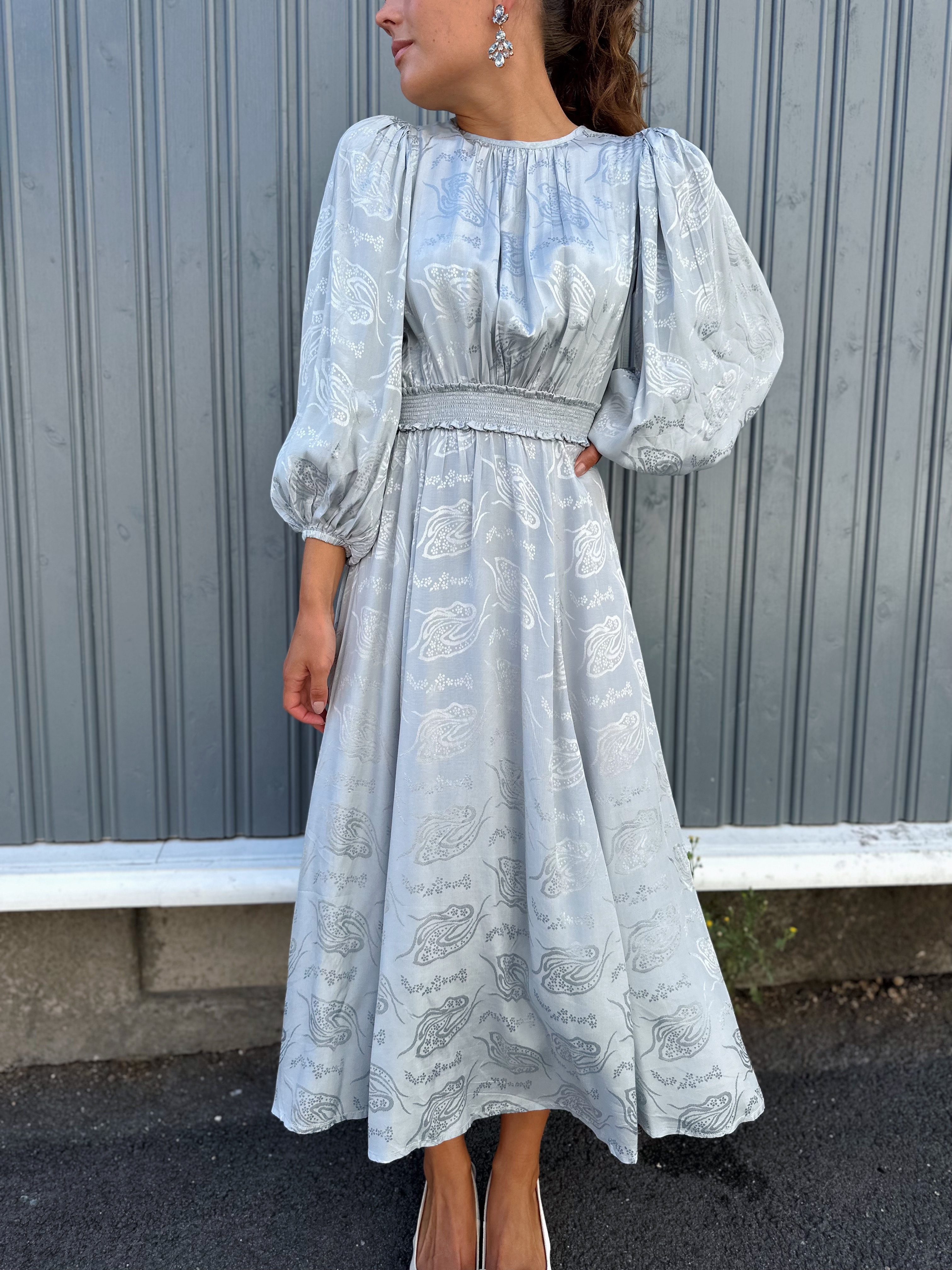 "Jacquard Midi Dress" fra byTiMo er en vakker kjole i nydelig sølvfarget jacquardmønster. Den har midi-lengde, strikk i livet som gir nydelig innsnevring og lange ermer. Kjolen har rund hals.