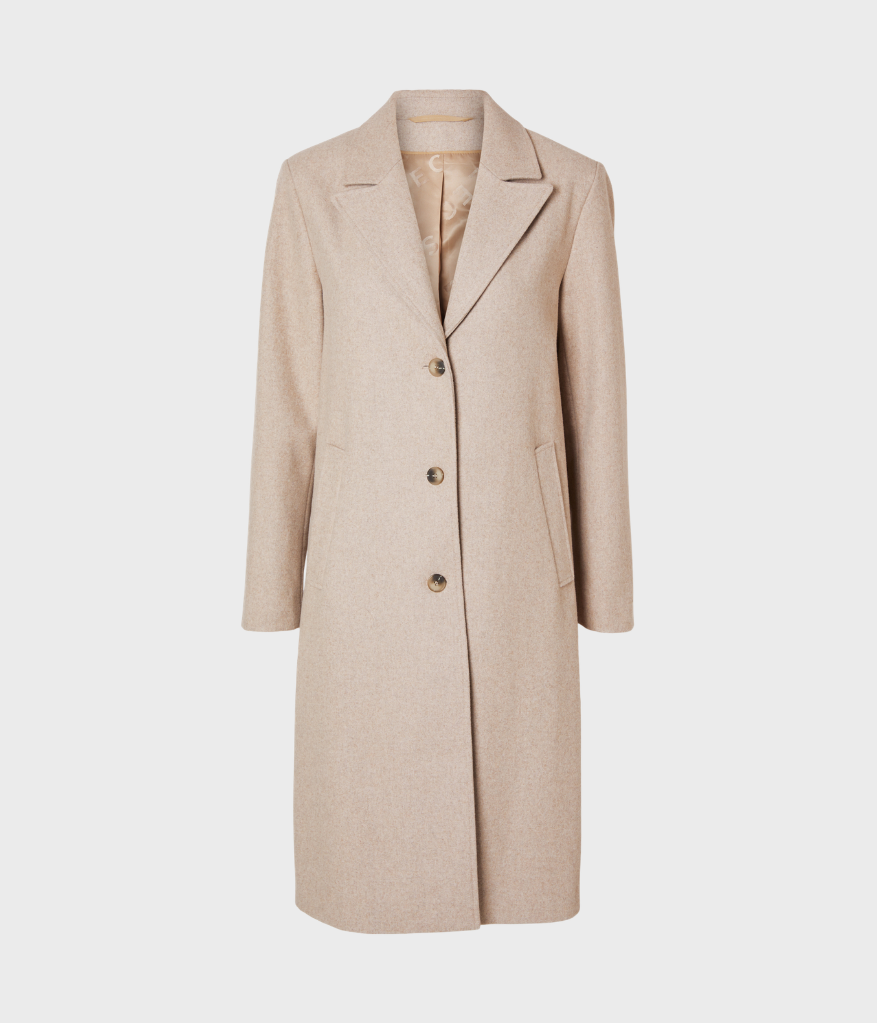 «Falma wool coat» fra Selected Femme er en klassisk lang ullkåpe. Den har krage, lang erm og lukkes med knapper.