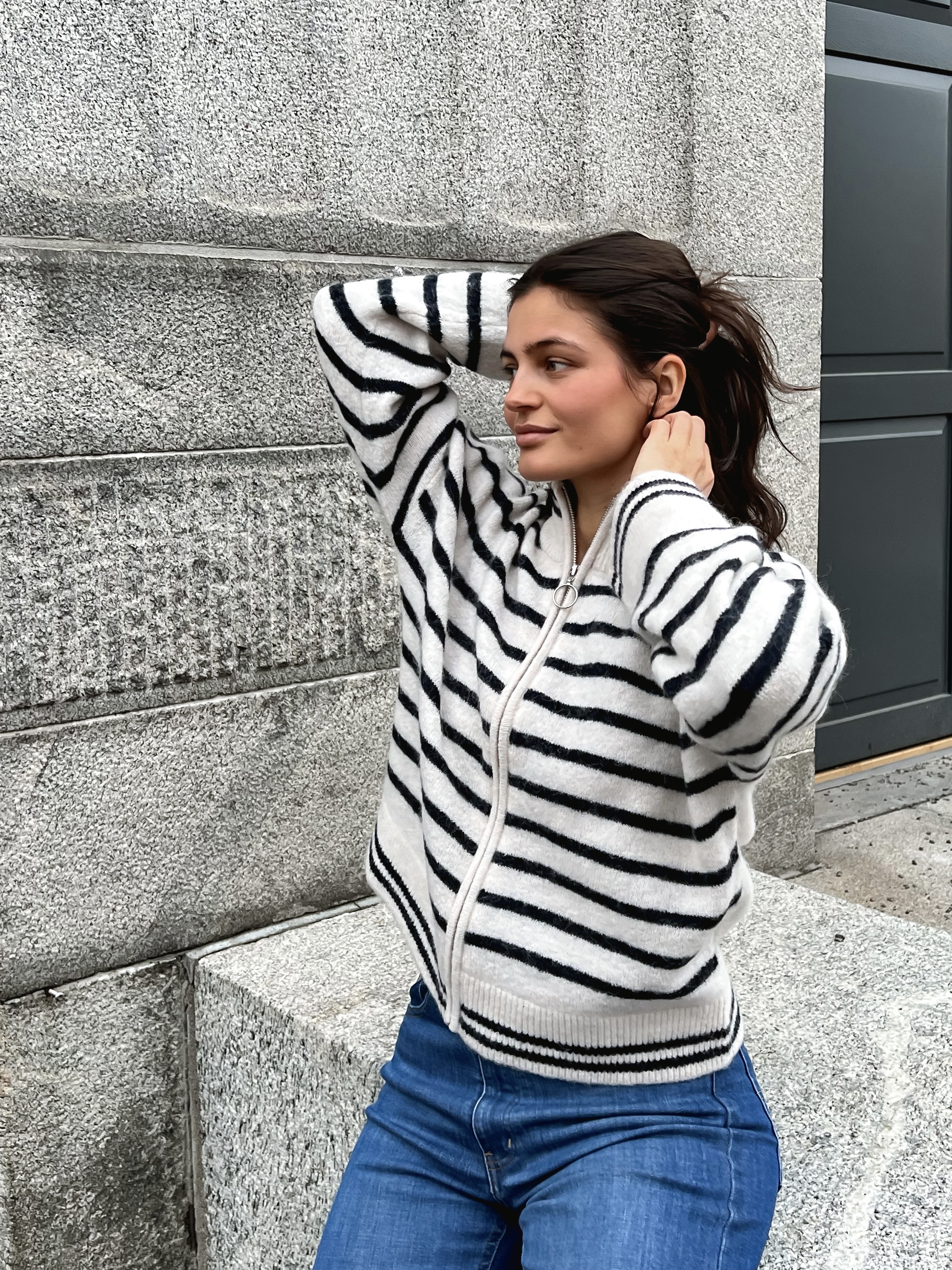 «Sia ras stripe knit cardigan» fra Selected Femme er en deilig og myk oversized strikket cardigan med store lommer foran og høy krage. Sia cardigan lukkes med glidelås.