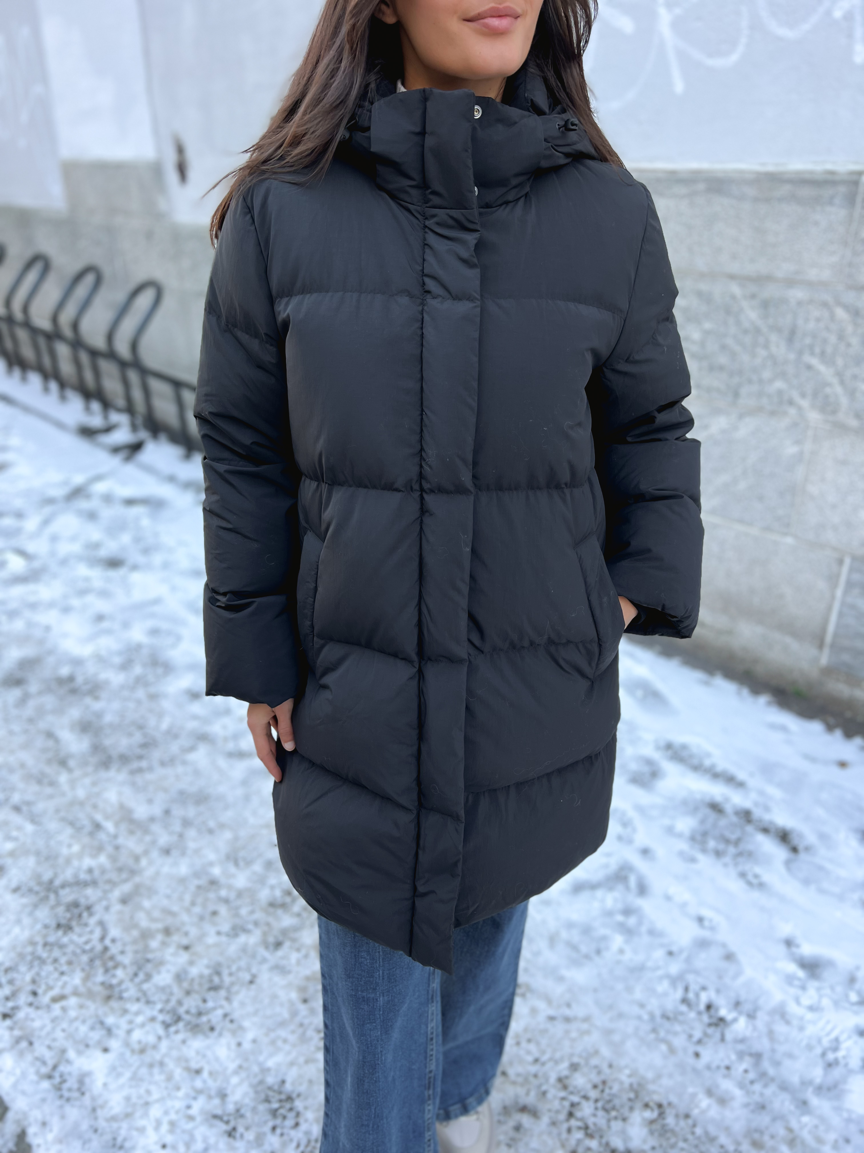 «Frigga redown jacket» fra Selected Femme. Klassisk sort dunjakke! Jakken er vattert, som er laget med fokus på slitestyrke. Den har høy hals og avtakbar hette med justerbare snorlåser, samt stormmansjetter. Glidelåsen foran er dekket av en trykknappstrimmel for ekstra isolasjon, og den er polstret med resirkulert Re:Down®-polstring. Den er også vannavstøtende, noe som betyr at den beskytter deg når du blir overrasket av plutselige regnskyll. Jakken er super allsidig, passer perfekt til alt fra kontor- til helgeantrekk.