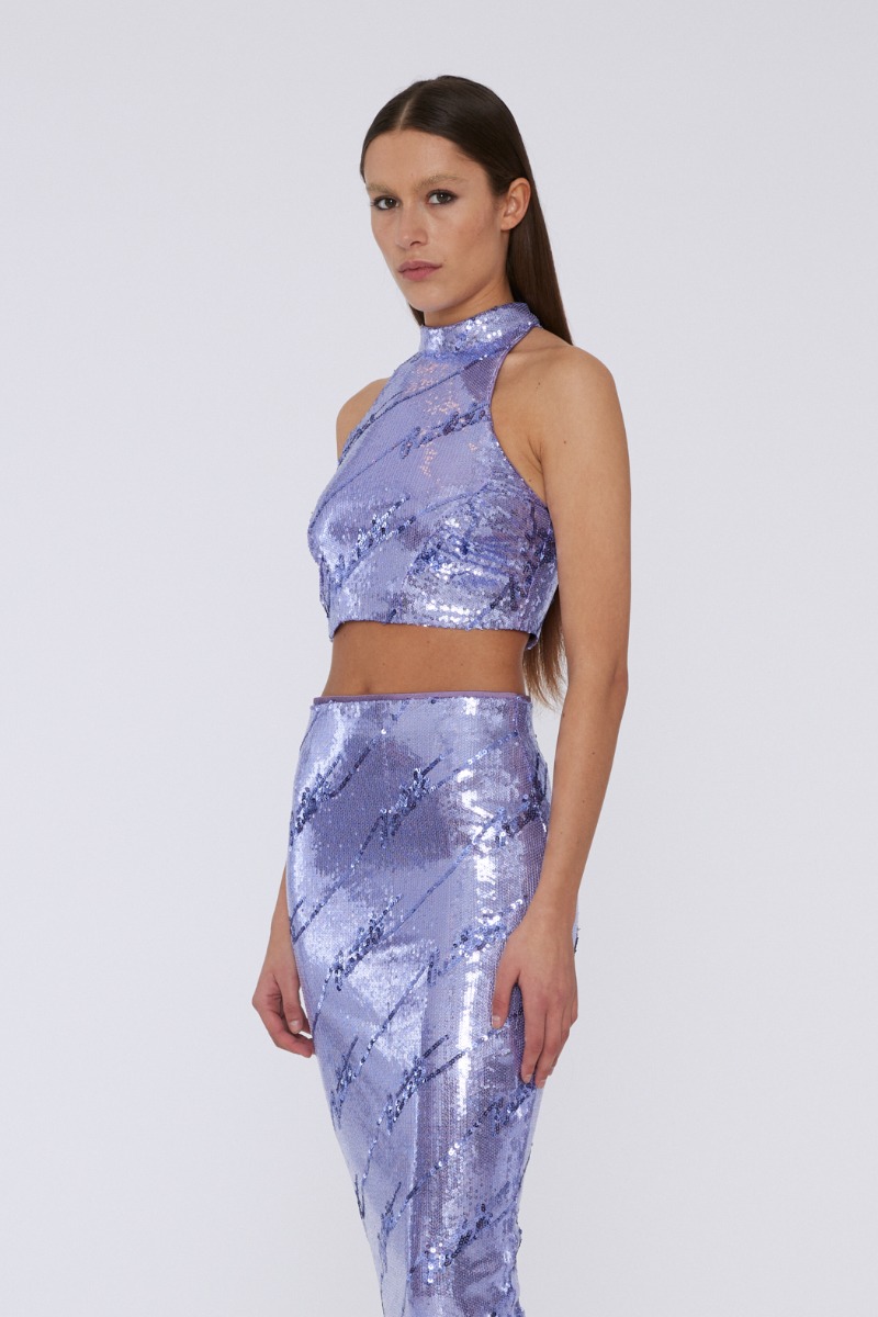 «Sequins high neck top» fra Rotate. Lekker kort paljett - topp. Lukkes med glidelås bak. Matcher perfekt sammen med «Sequins skirt».