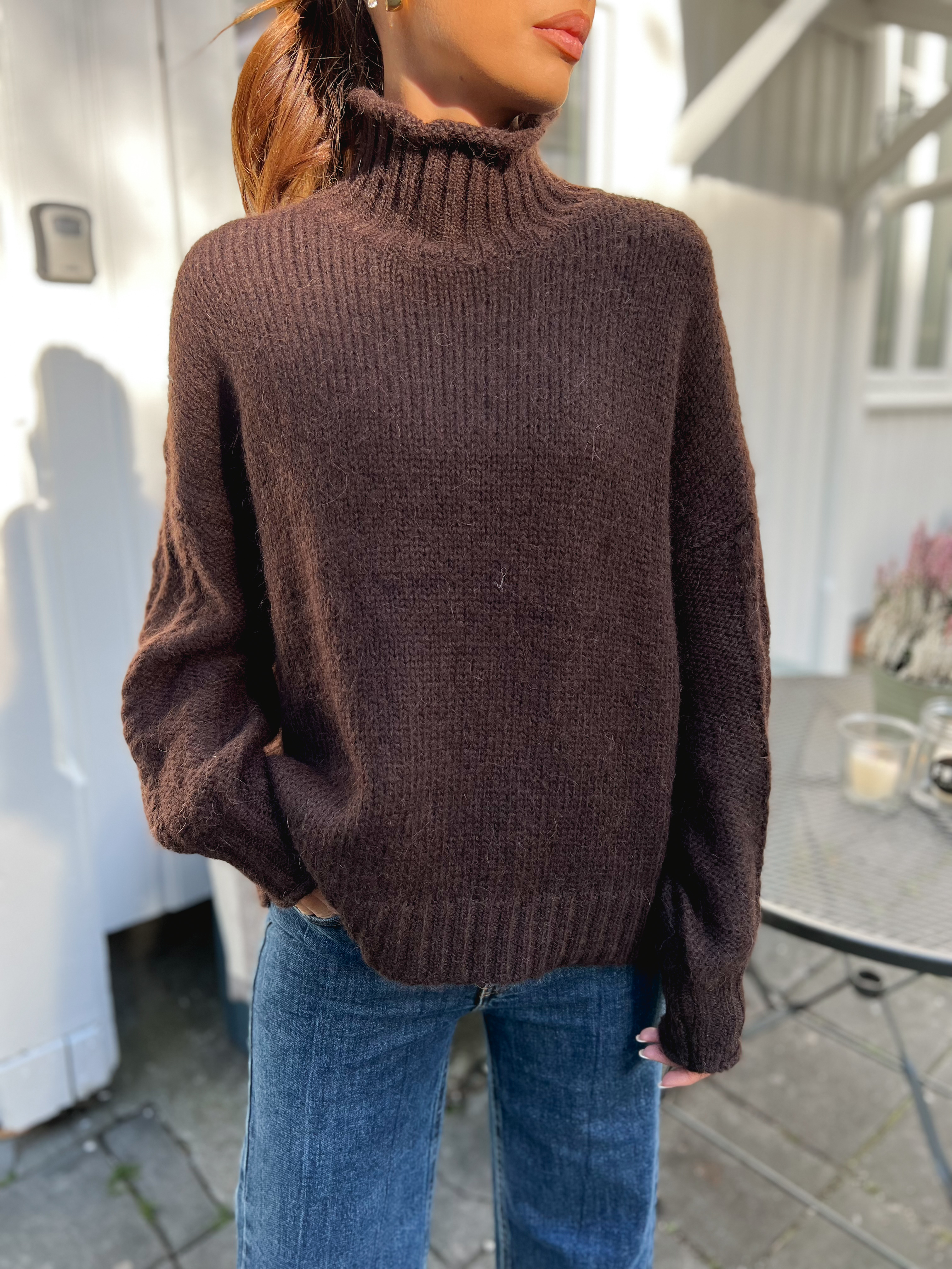 «Siera highneck knit pullover» fra Yas. Herlig høyhalset strikkegenser i nydelig brunfarge. Den har ballongermer. Ribbet strikk detaljer rund halsen og ermene.