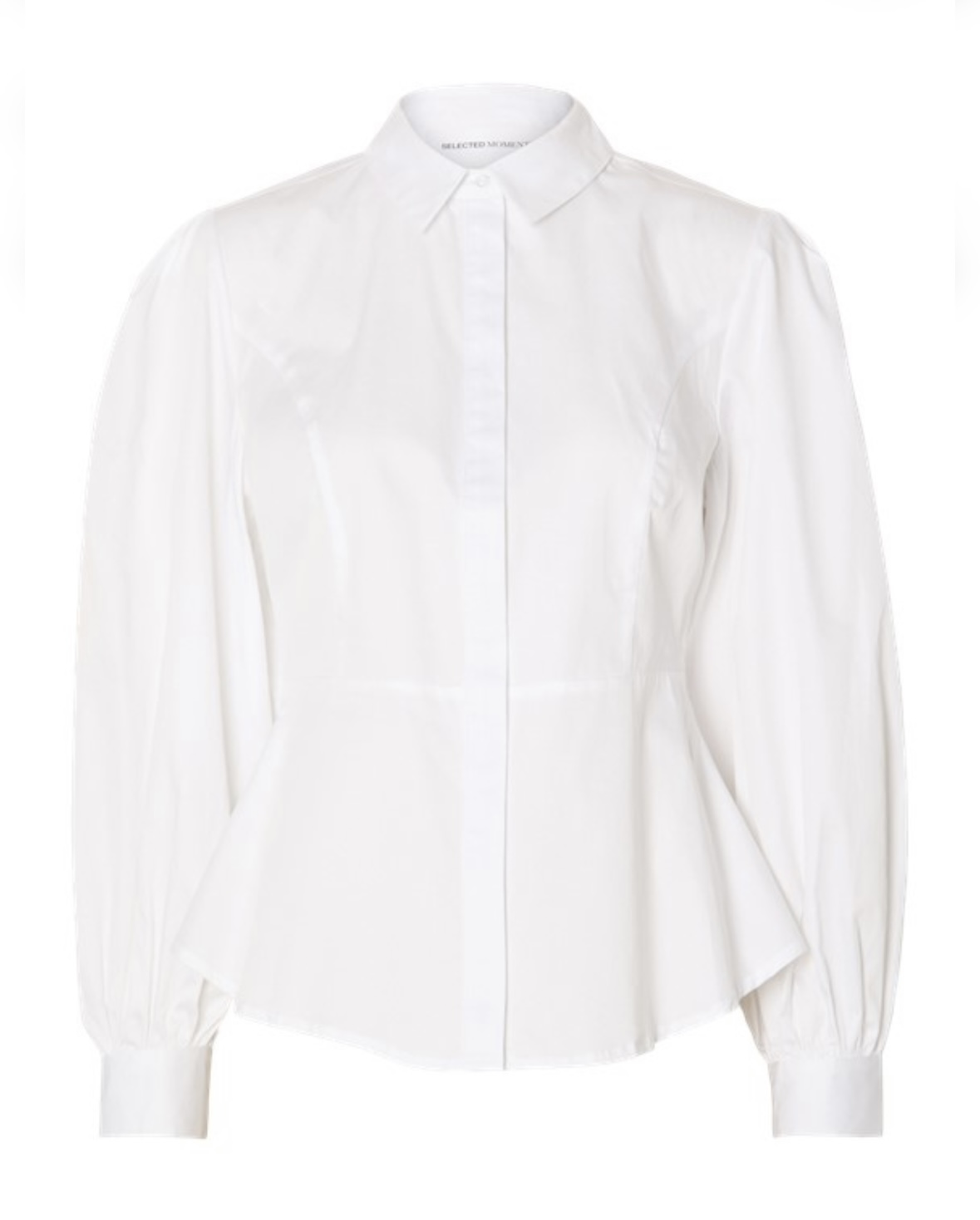 "Vivi Fitted Shirt - Snow White" er en klassisk innsvingt hvit skjortebluse med skjult knepping i front. Blusen har skjortekrage og litt vidde i arm med knapp i mansjett.