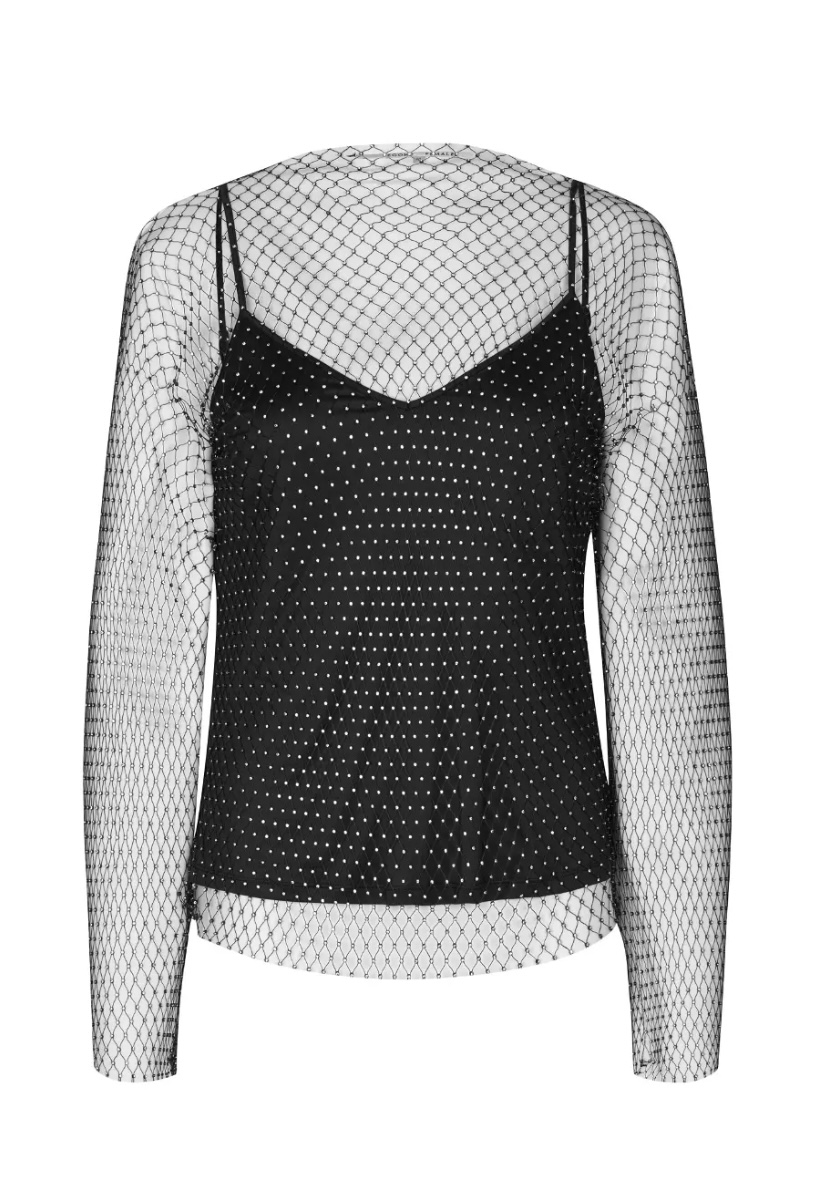 «Gloss blouse» fra Second Female er den perfekte party blusen! Den har rund hals, lang erm. Gjennomsktig stoff med glitrende sølv stener. Sort singlett inni.