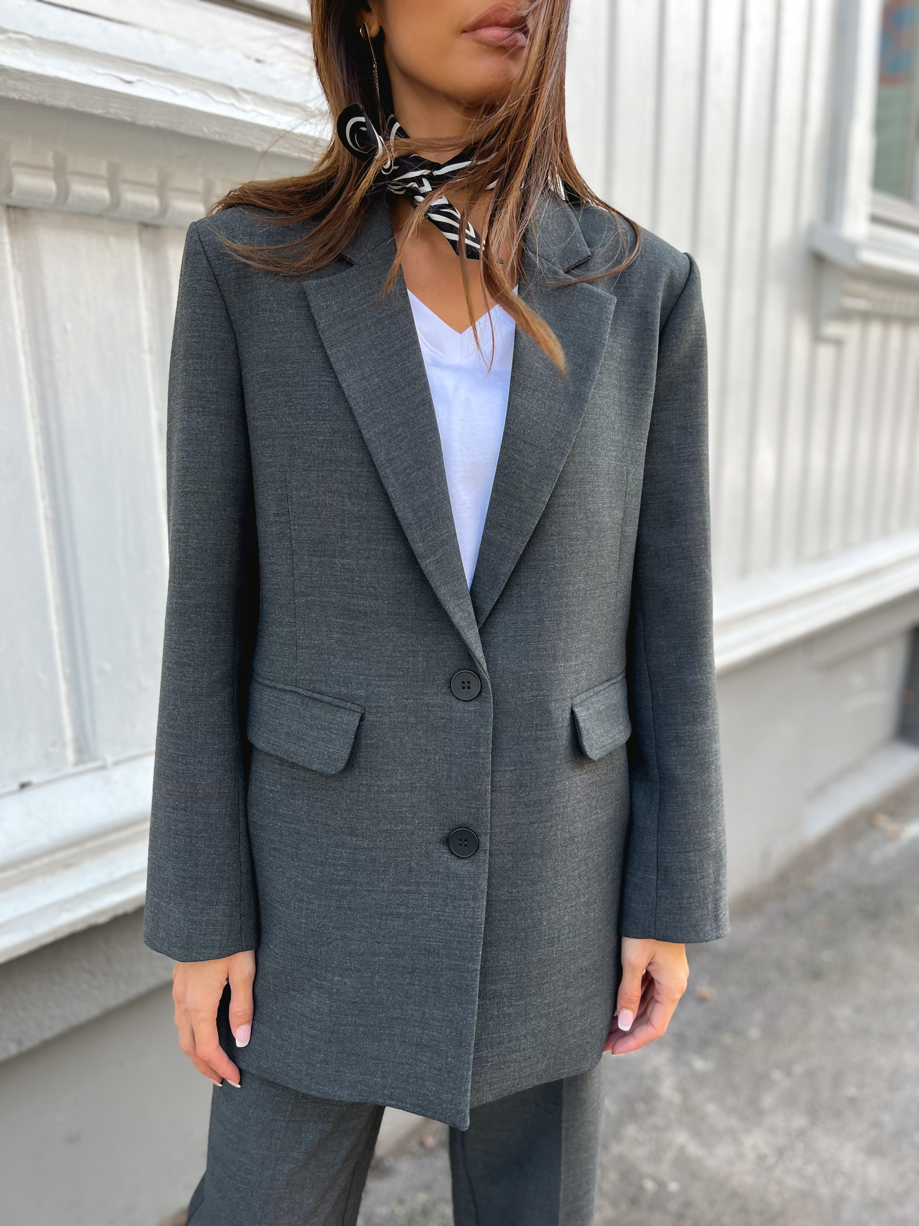«Rita relaxed blazer» fra Selected Femme er en oversized blazer. Den har en avslappet passform, tynne skulderputer, lommer i front og lange ermer. Lukkes med knapper.