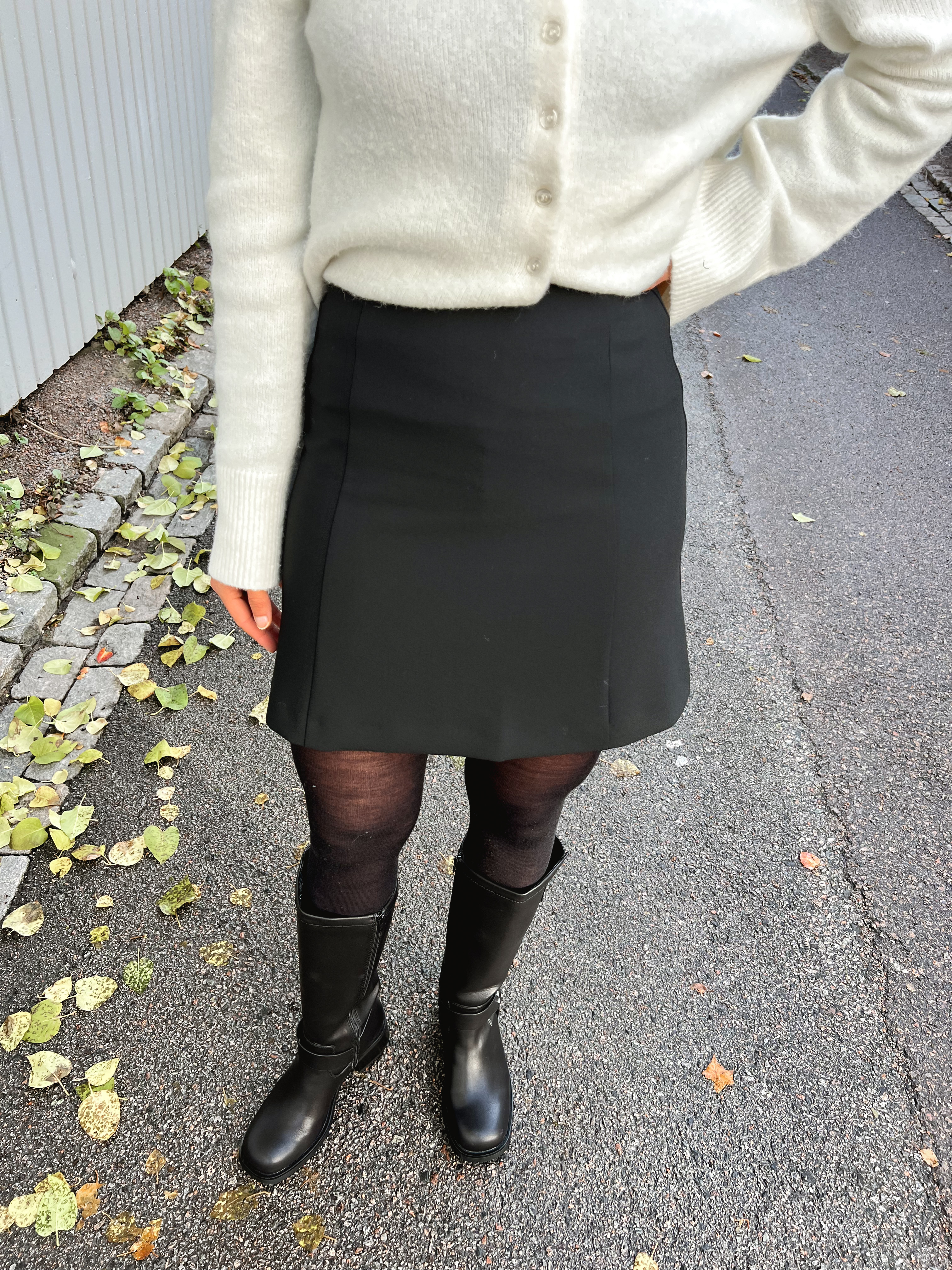 «Rita short skirt» fra Selected Femme er et klassisk sort skjørt med høy midje. A-formet skjørt.