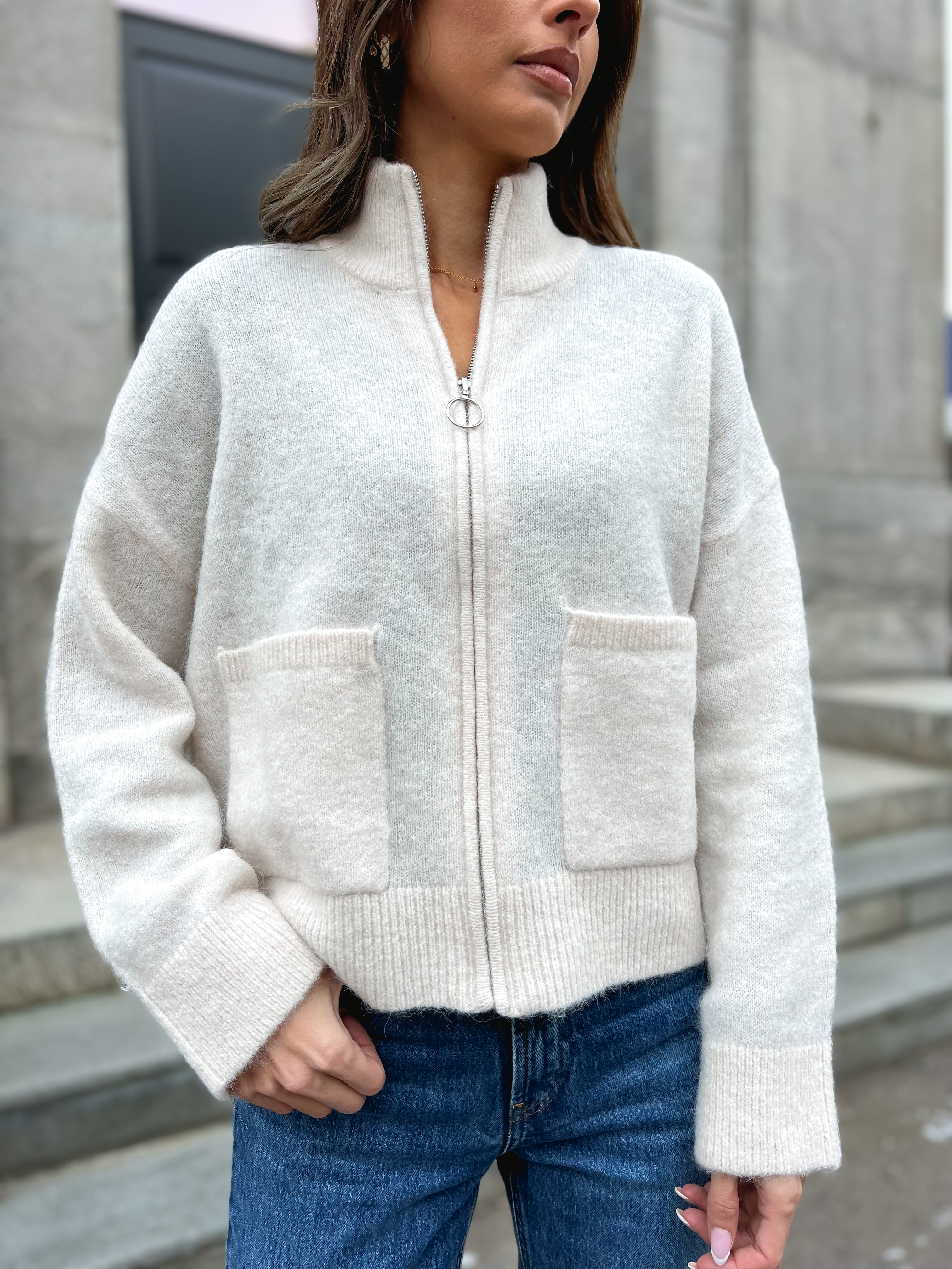 «Sia ras zipper knit cardigan» fra Selected Femme er en deilig og myk oversized strikket cardigan med store lommer foran og høy krage. Sia cardigan lukkes med glidelås.