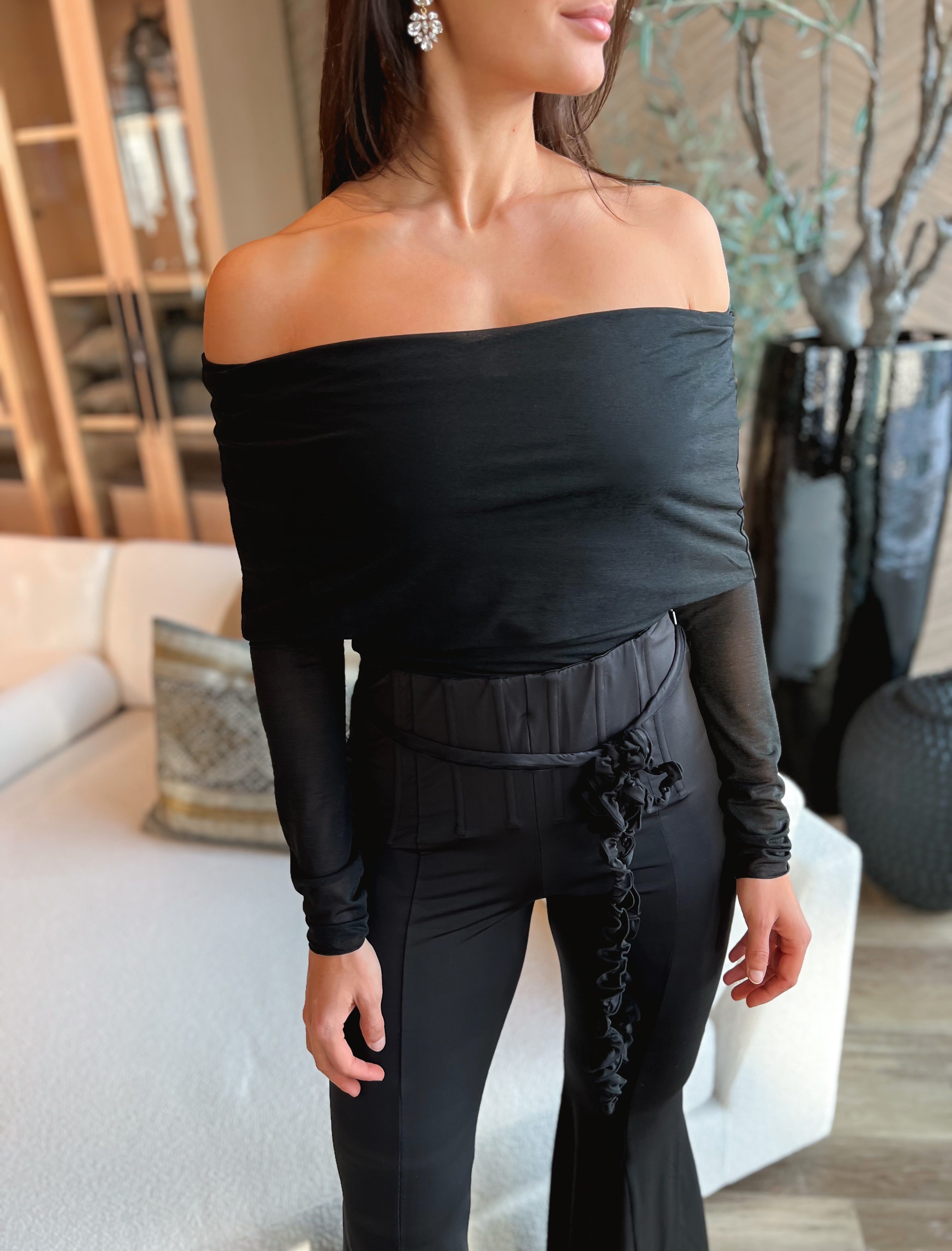 «Cheer off-shulder top» fra Rotate. Lekker tettsittende off-shulder topp i sort.