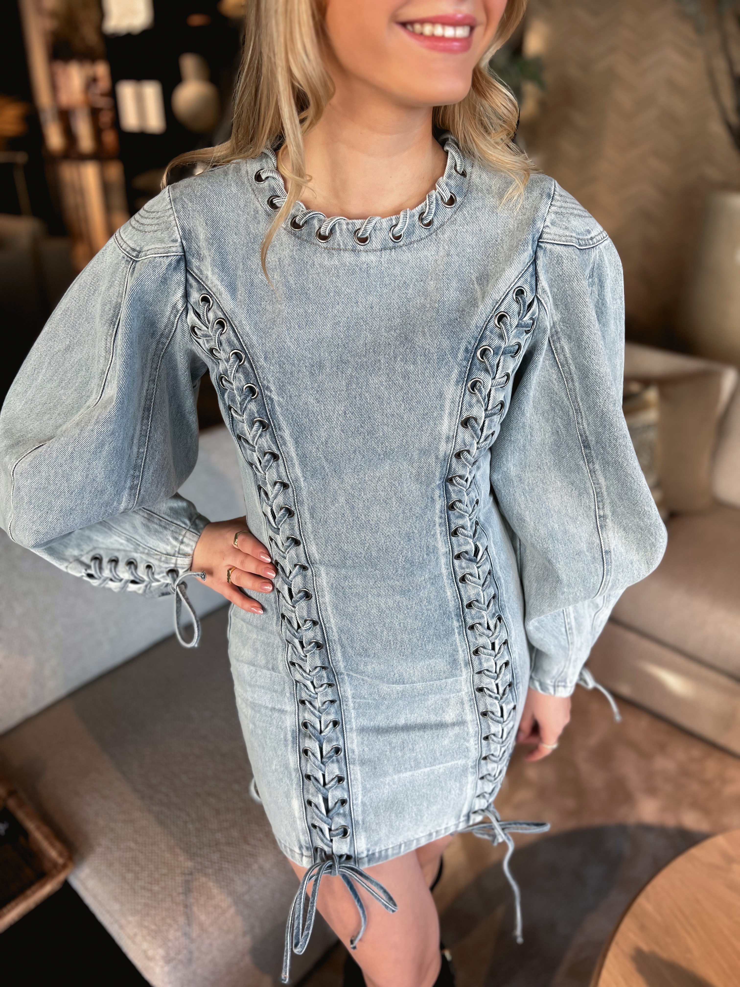 «Denim lace mini dress» fra Rotate. Råkul minikjole i denimstoff. Kjolen har knyting på begge sidene som gjør den ekstra kul. Rund hals og store ermer. Lukkes med glidelås bak.