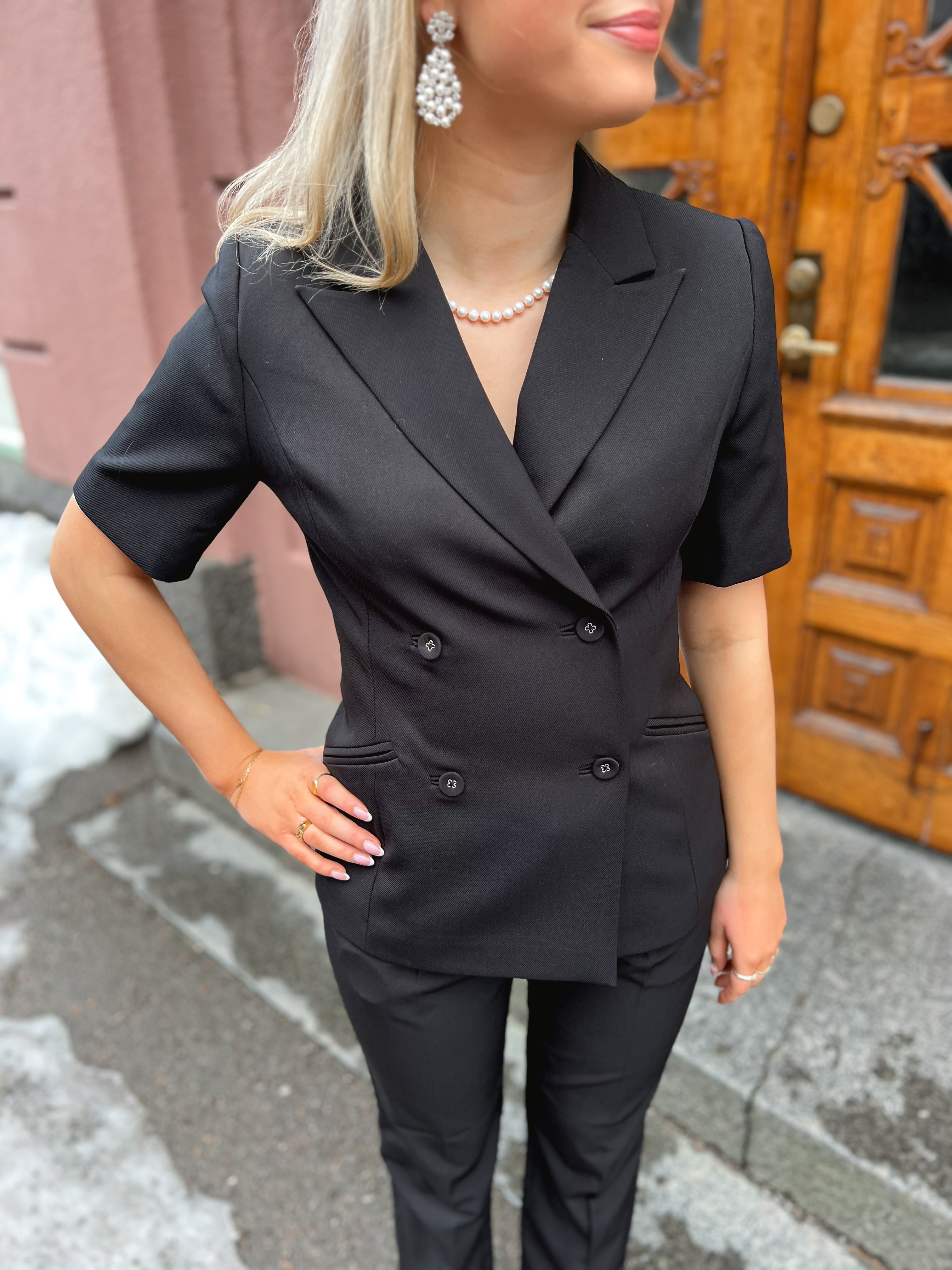«Franja» fra Custommade er en rålekker dobbelspennet blazer i sort med korte ermer. Franja har en feminin passform.
