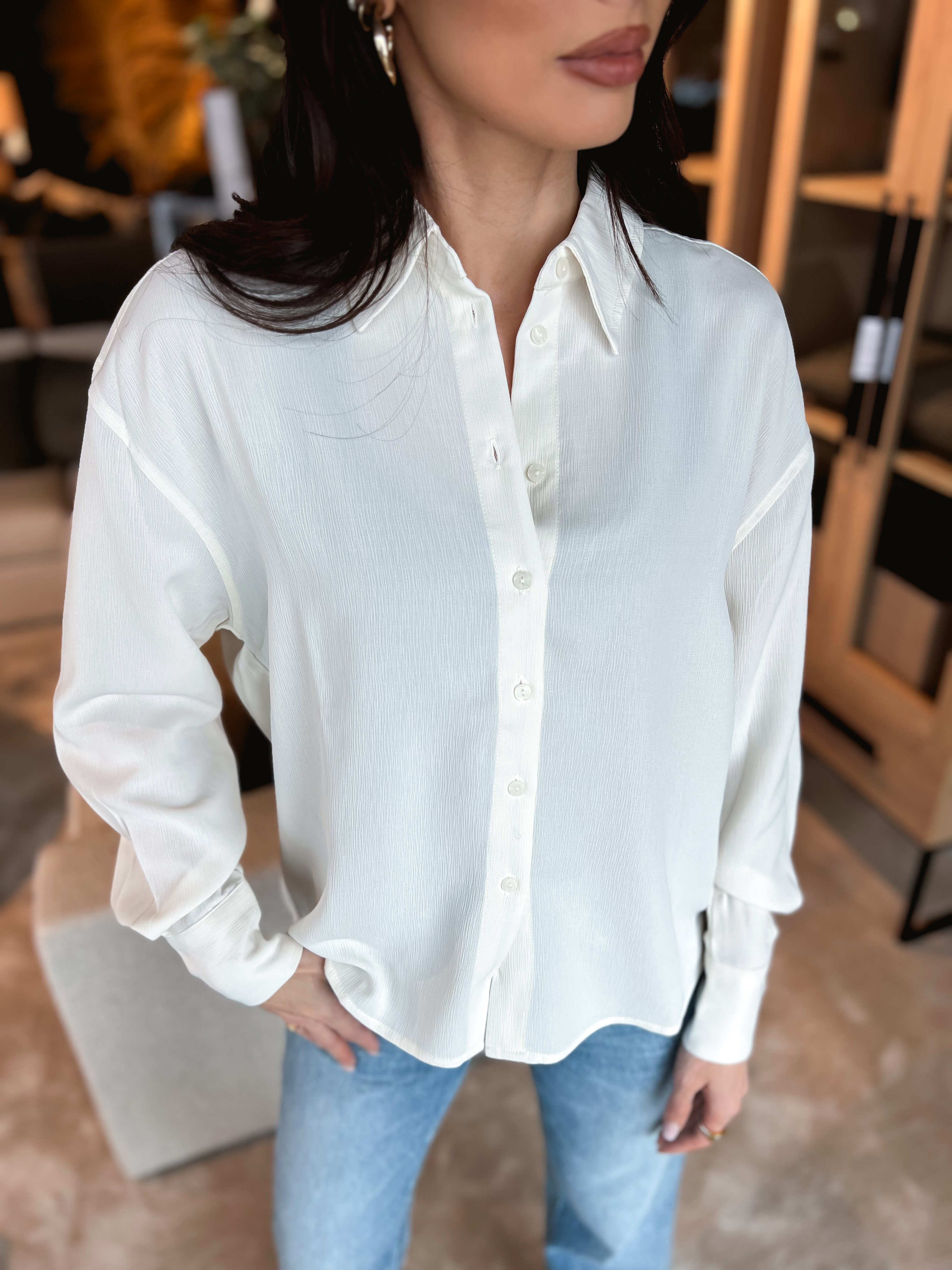 «Parrot shirt» fra YAS. Klassisk hvit skjorte i «Whisper white». Skjorten har krage, lang erm og lukkes med knapper.