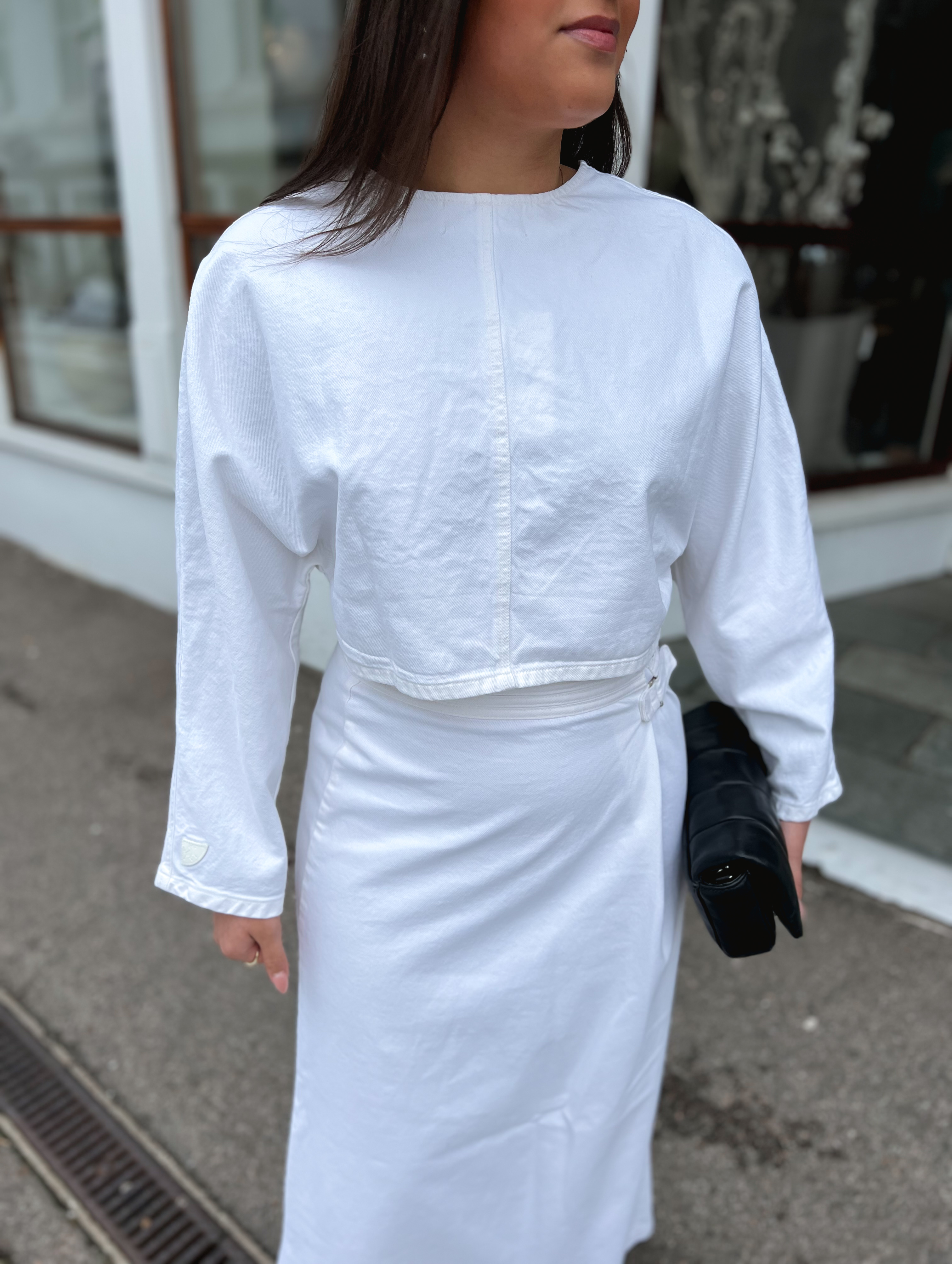 «Lucy otawa bolero» fra Lois er en nydelig denim topp i hvit. Den har rund hals og nydelig detalj bak - med åpen rygg.