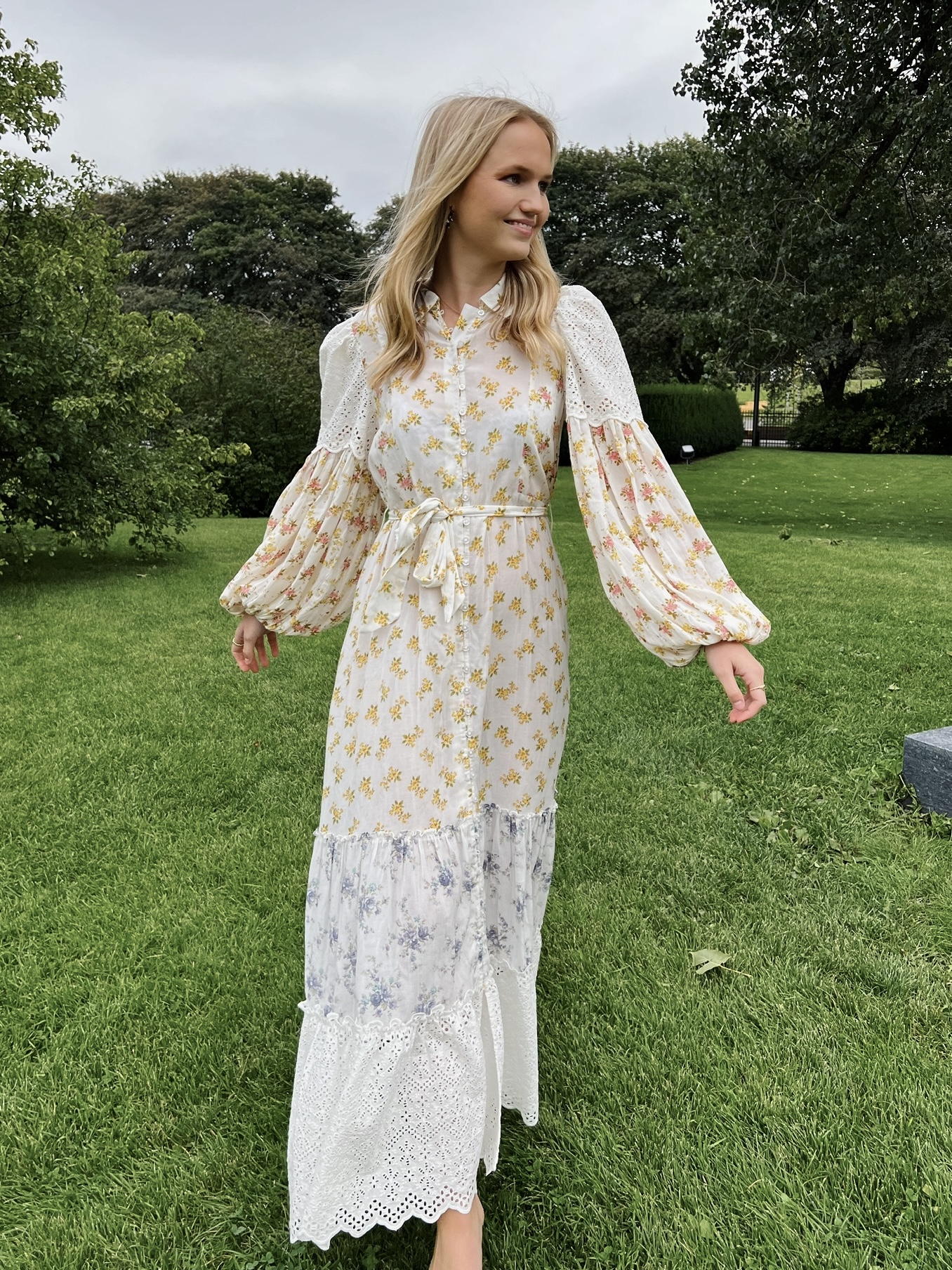 «Cotton slub shirt dress» fra byTiMo er en vakker lang kjole i lekre kombinerte blomsterprint. Kjolen har avtagbart knytebelte i midjen.